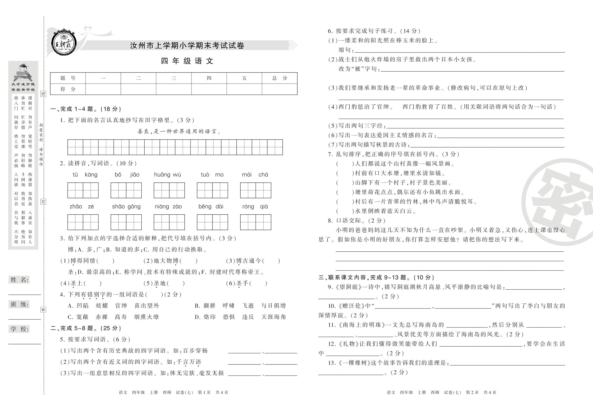 2016-2017学年第一学期汝州市四年级语文试卷(西师版)【7】