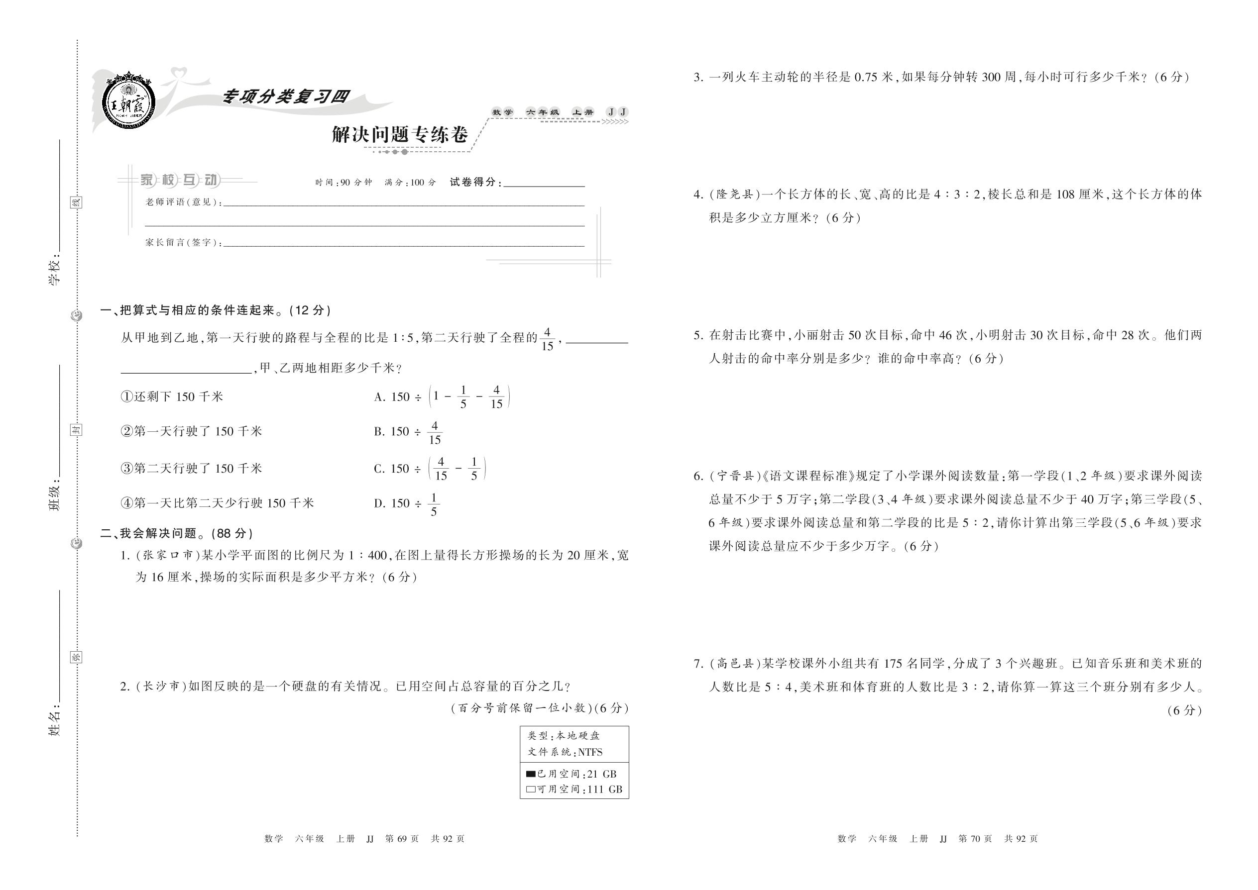 2021上册六年级数学冀教版 解决问题专练卷