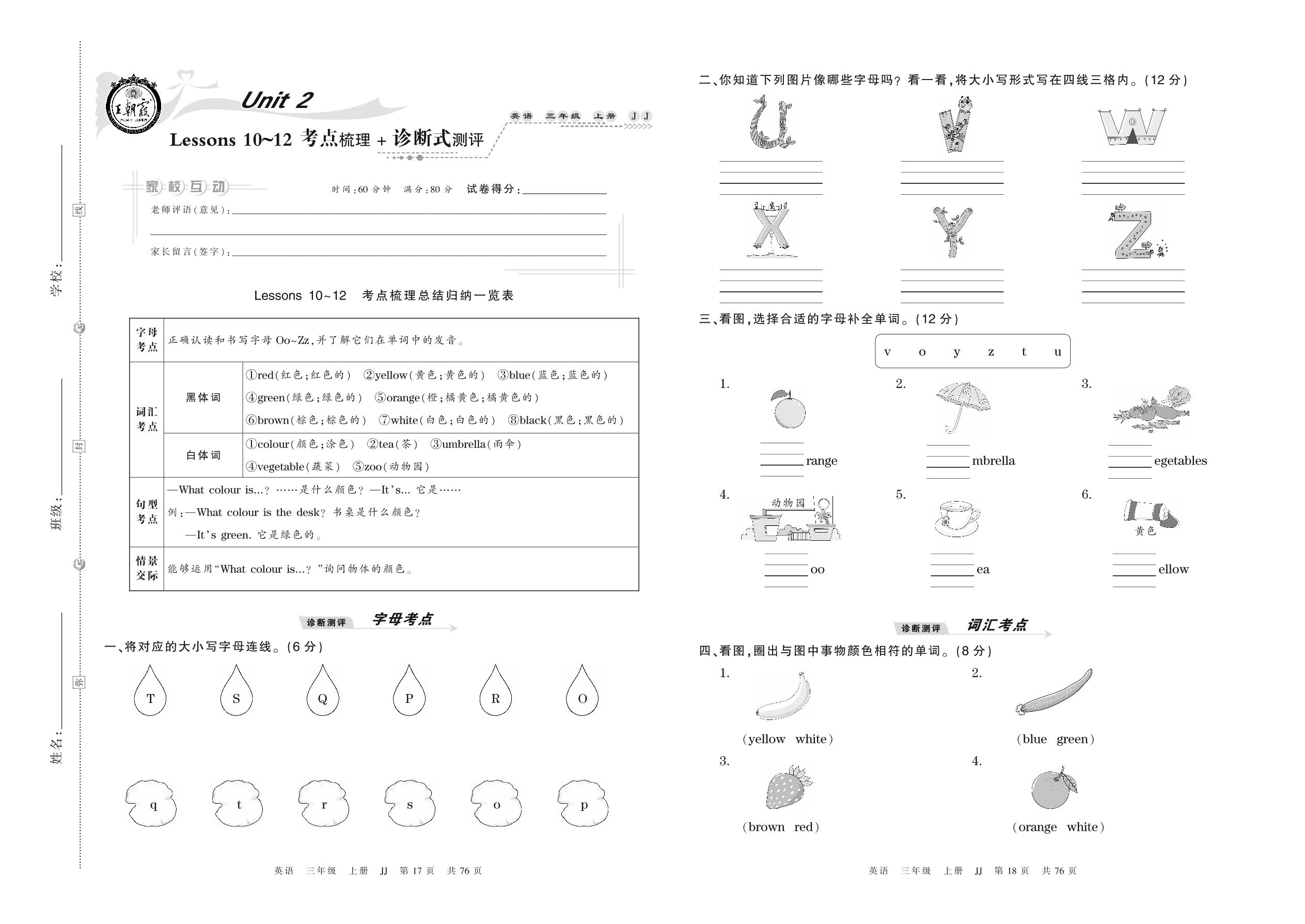 2021上册三年级英语冀教版 Unit 2 Lessons 10~12 考点梳理 + 诊断式测评