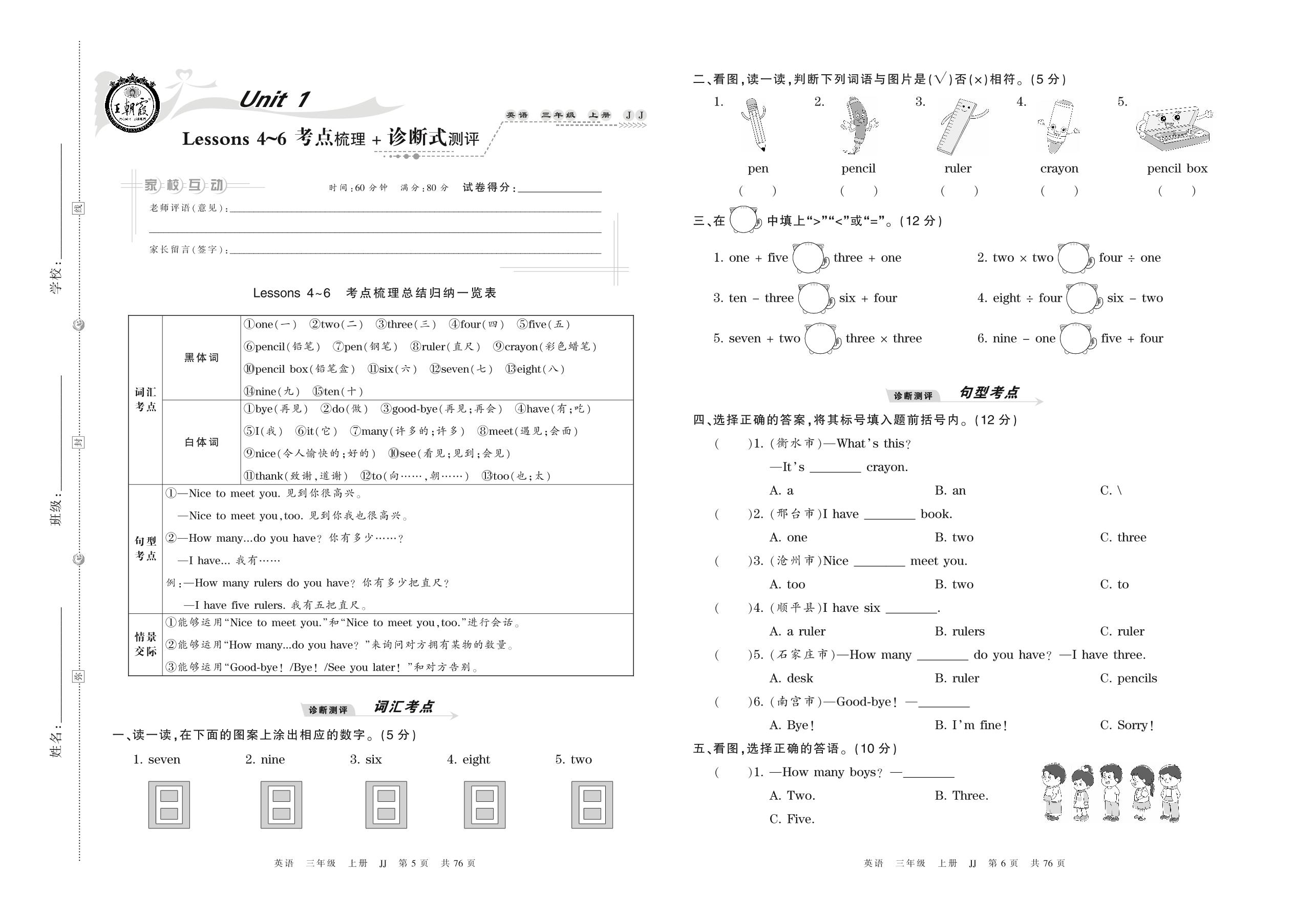 2021上册三年级英语冀教版 Unit 1 Lessons 4~6 考点梳理 + 诊断式测评