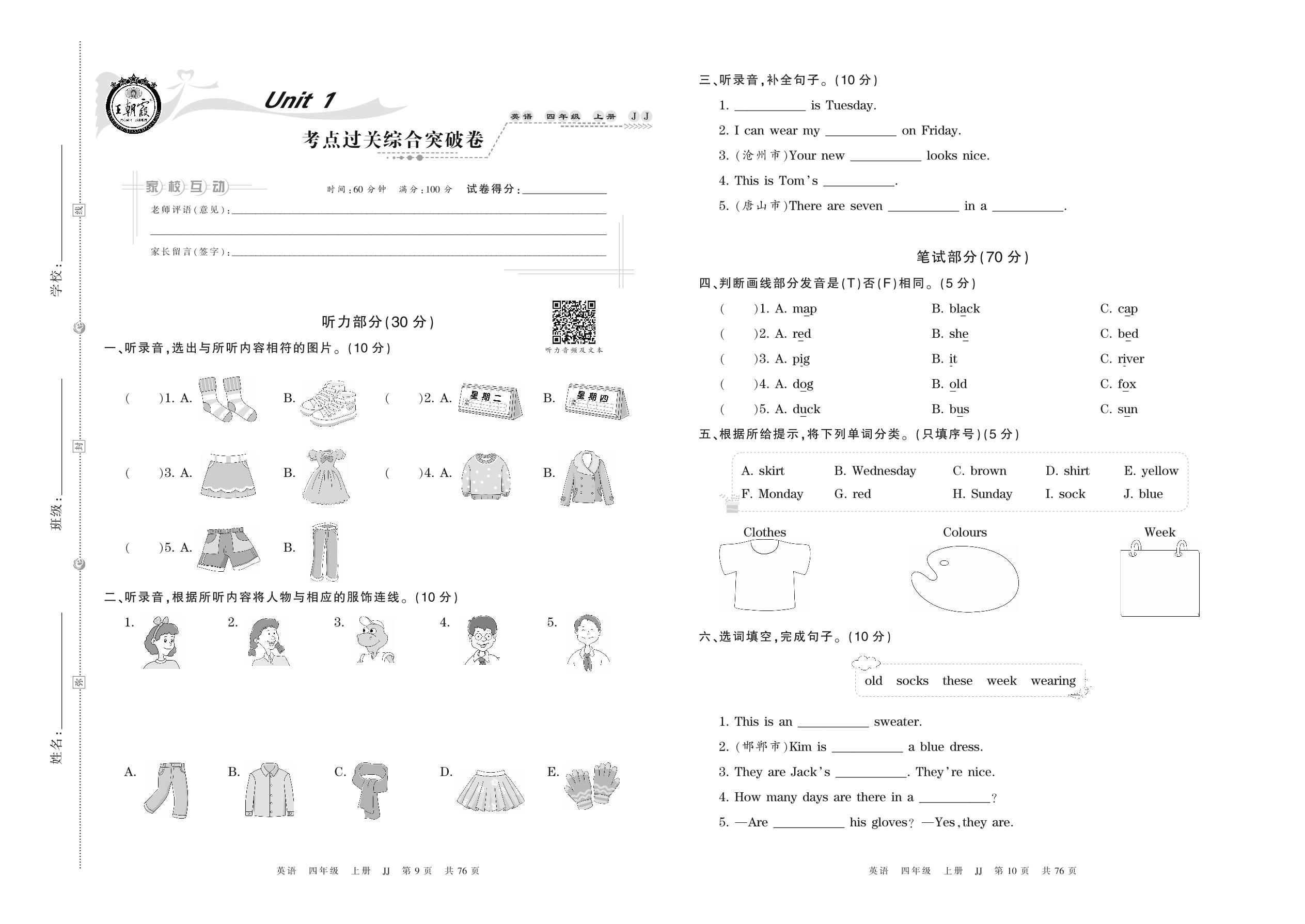 2021上册四年级英语冀教版 Unit 1 考点过关综合突破卷