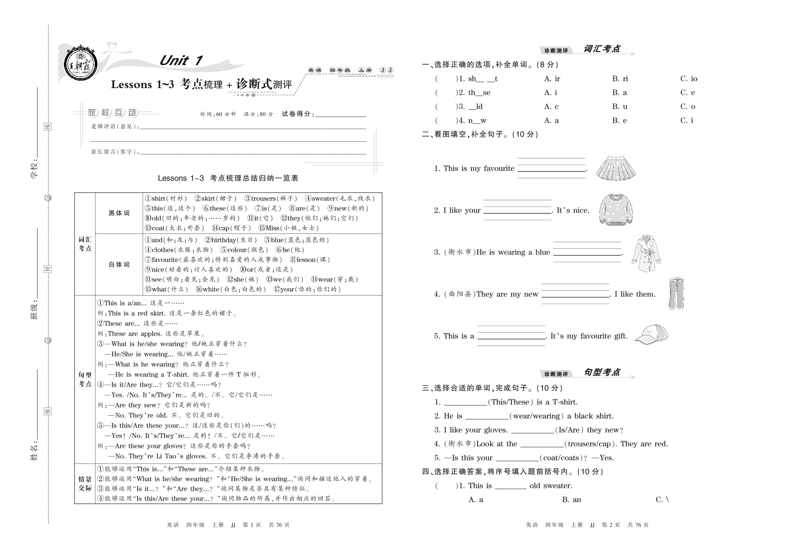 2021上册四年级英语冀教版 Unit 1 Lessons 1~3 考点梳理 + 诊断式测评