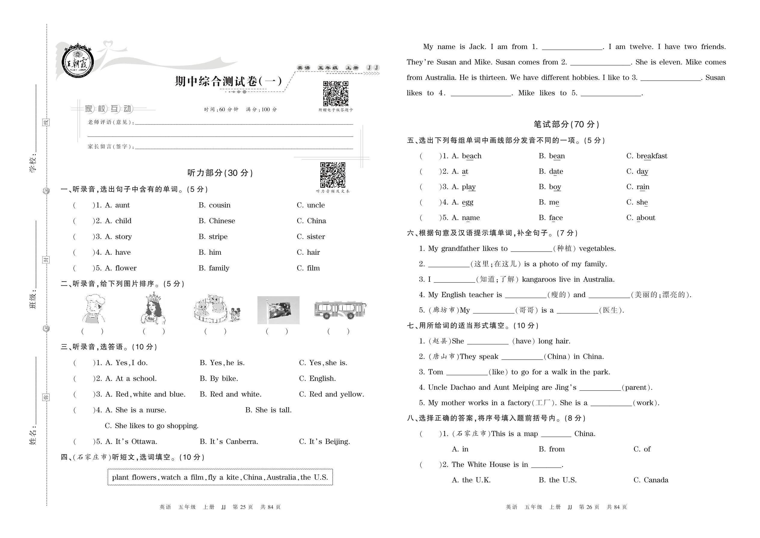 2021上册五年级英语冀教版 期中综合测试卷(一)