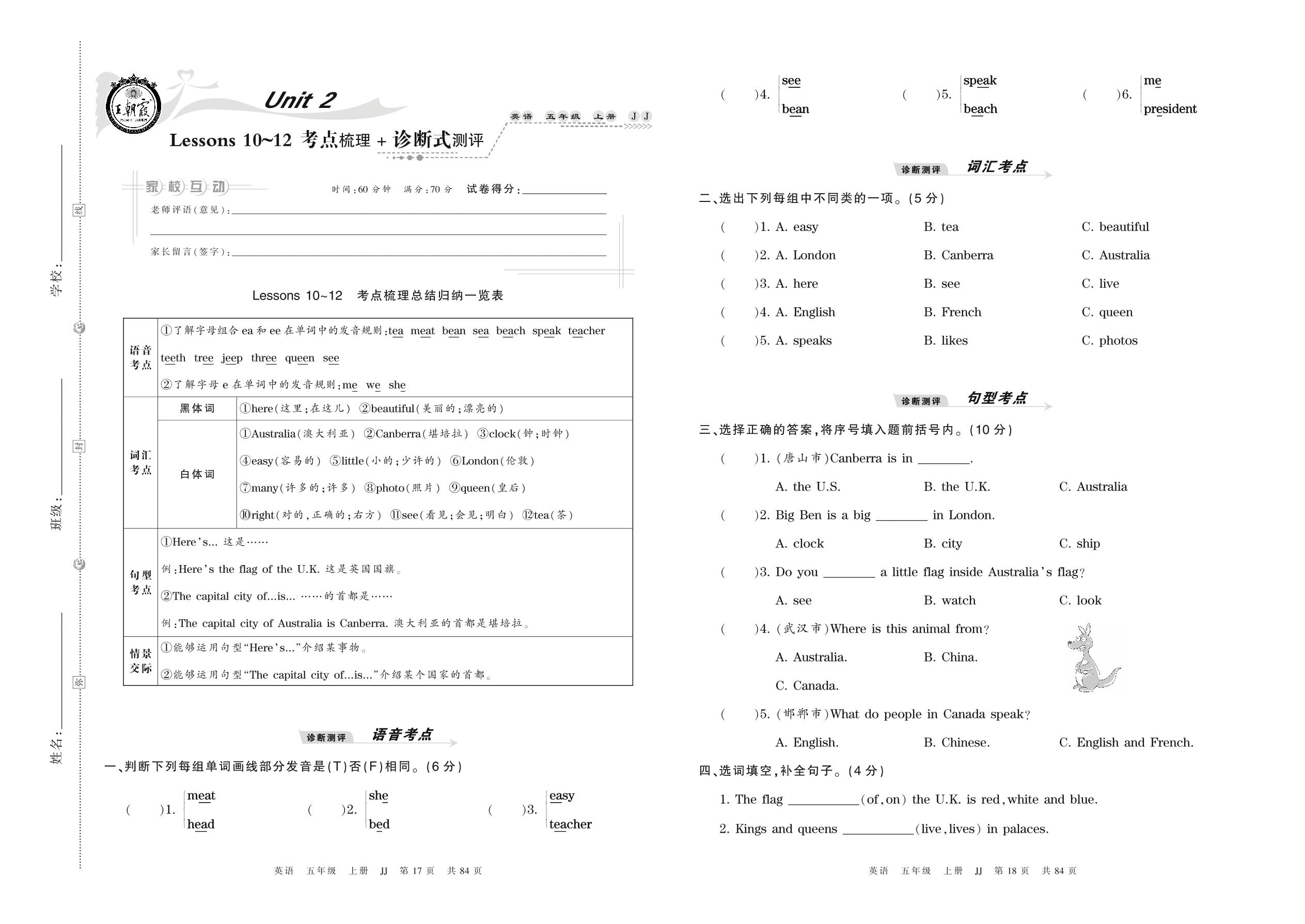 2021上册五年级英语冀教版 Unit 2 Lessons 10~12 考点梳理 + 诊断式测评