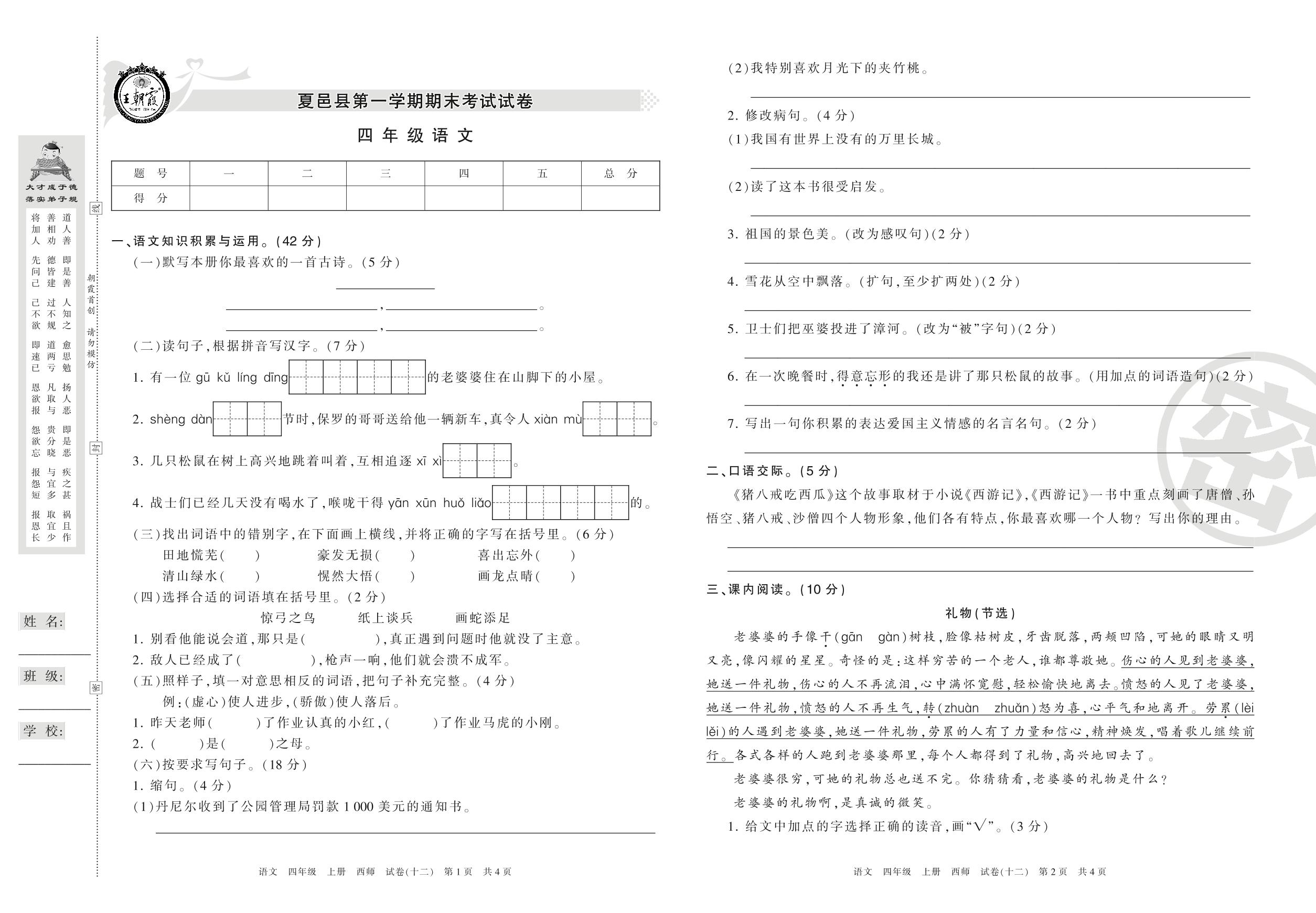 四年级语文西师版上册期末卷
