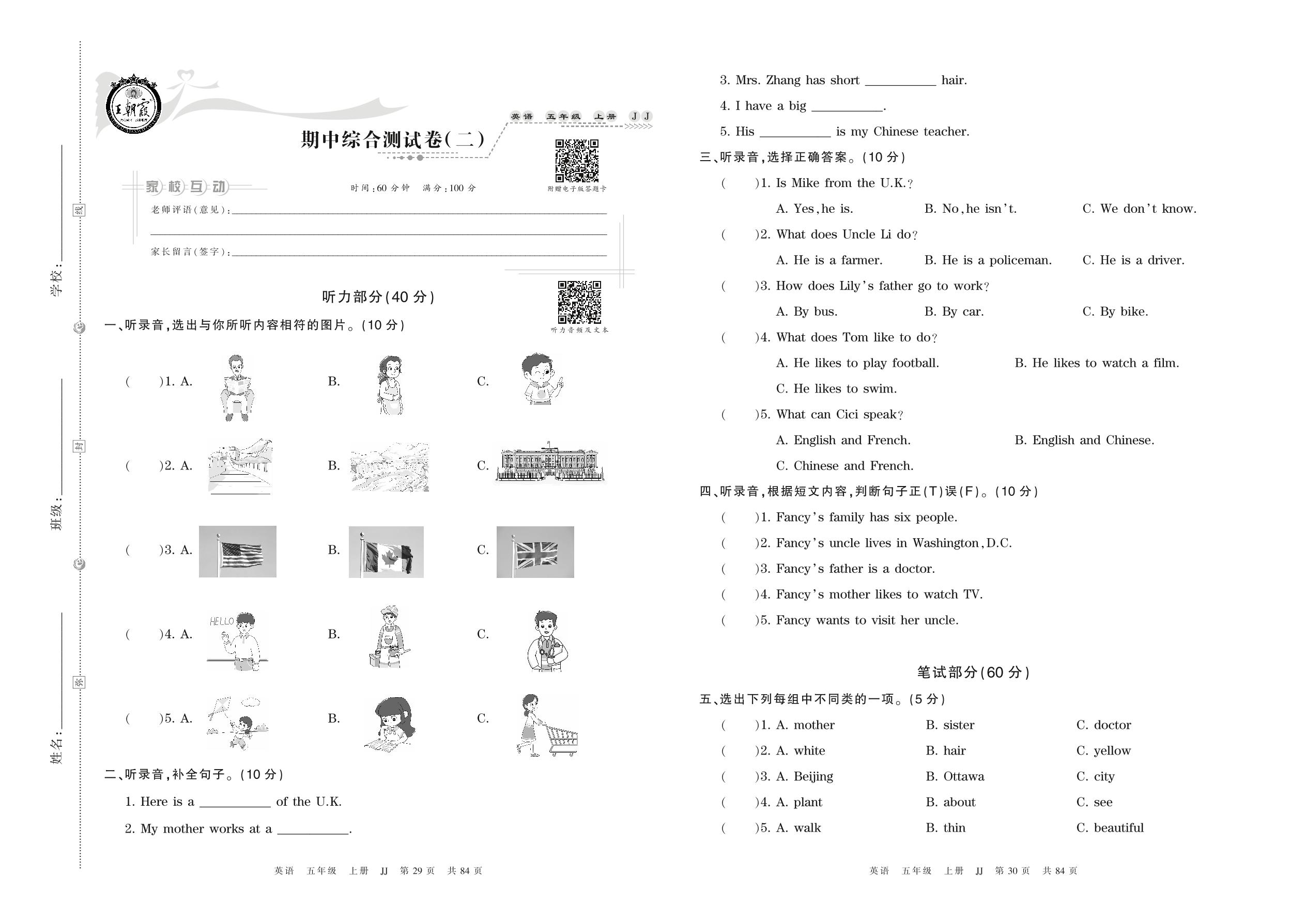 2021上册五年级英语冀教版 期中综合测试卷(二)