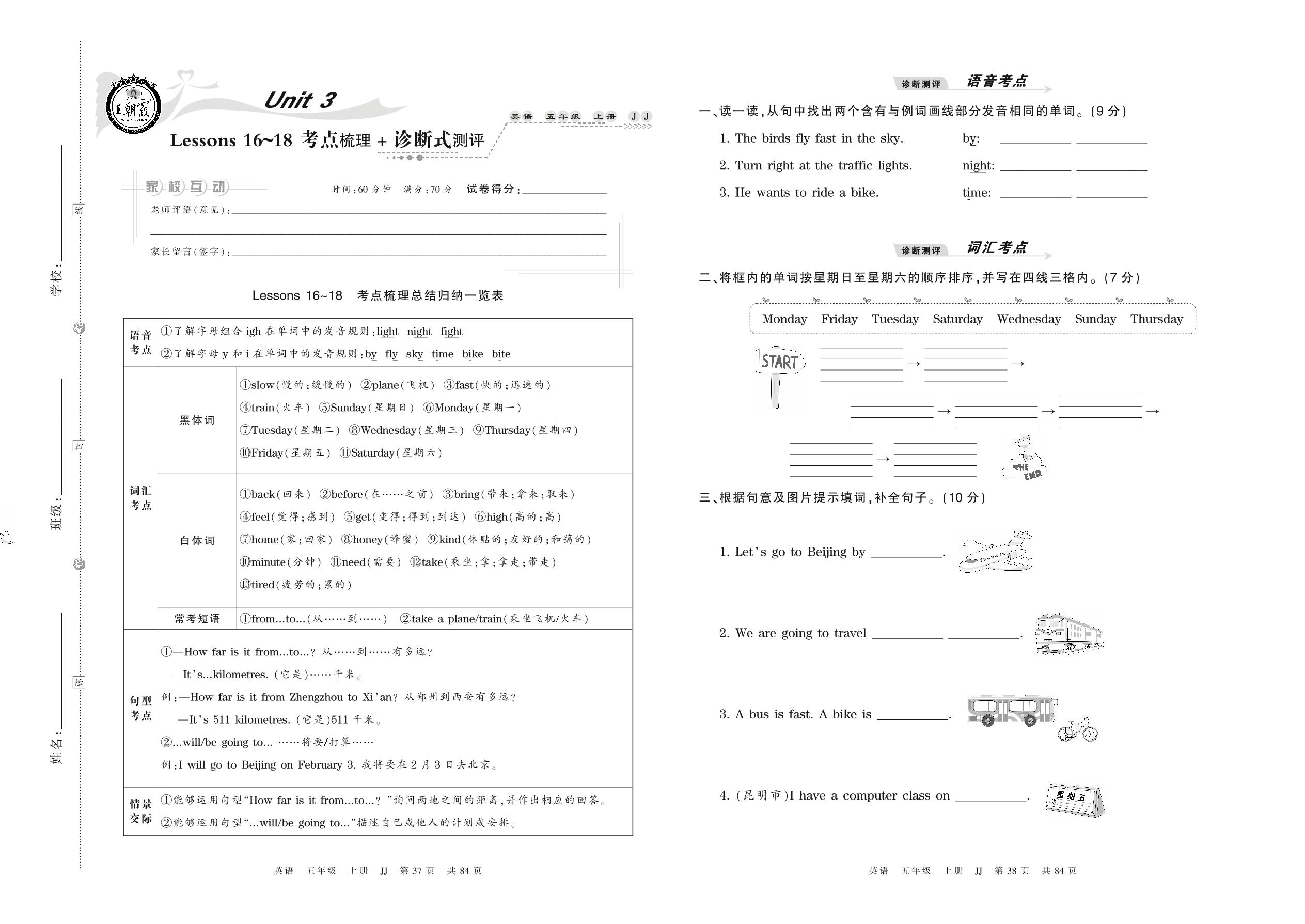 2021上册五年级英语冀教版 Unit 3 Lessons 16~18 考点梳理 + 诊断式测评