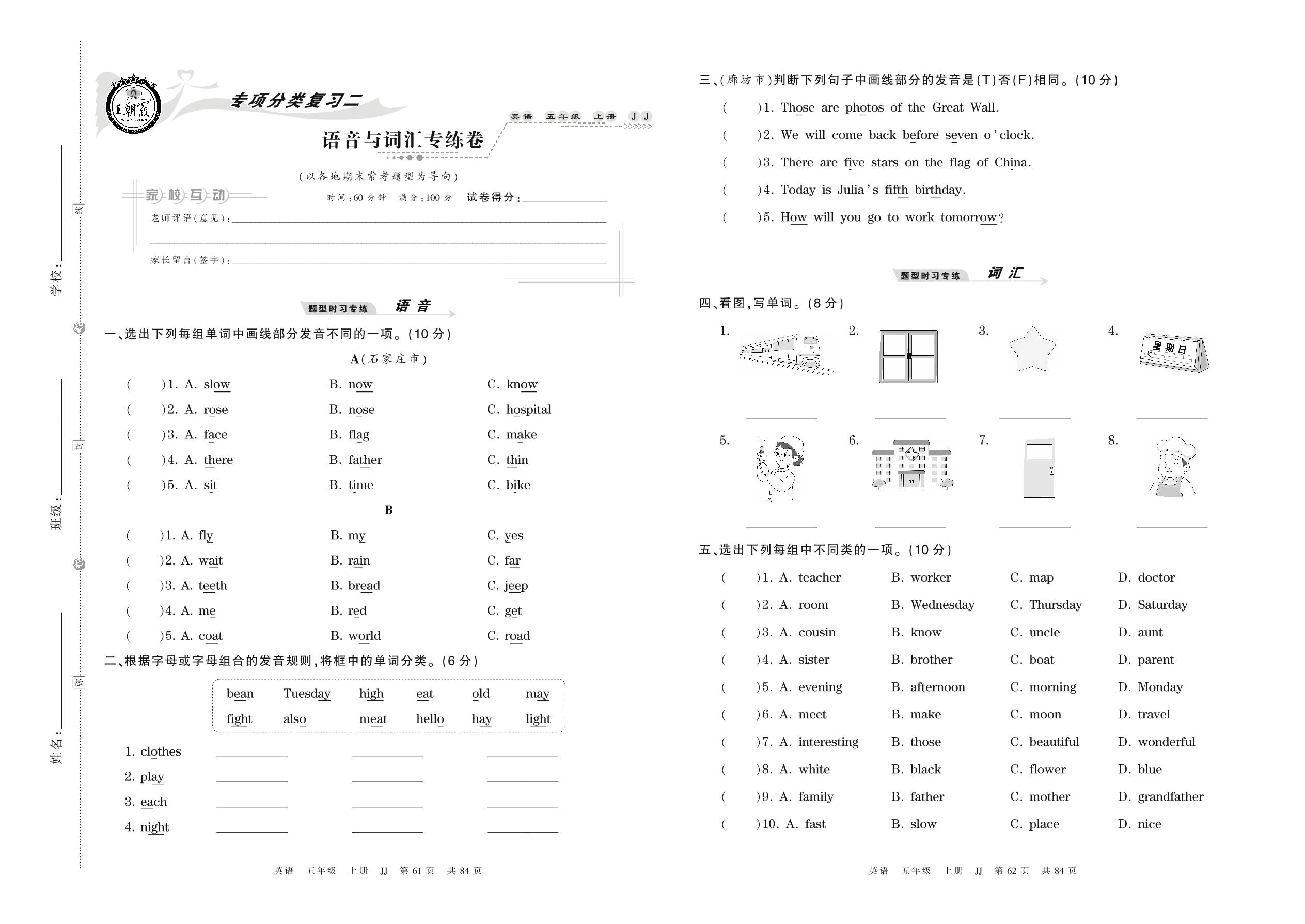 2021上册五年级英语冀教版 语音与词汇专练卷