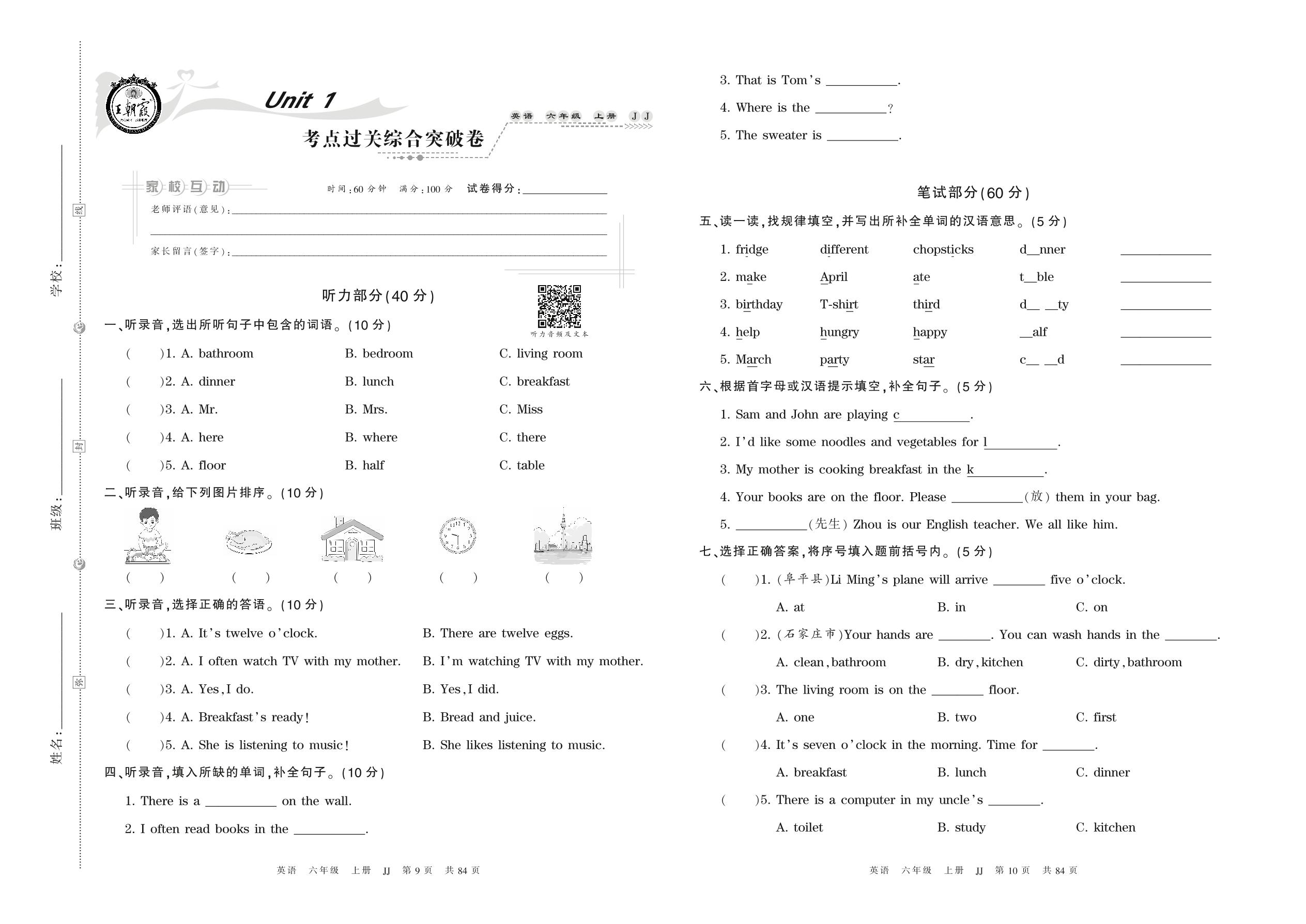 2021上册六年级英语冀教版 Unit 1 考点过关综合突破卷