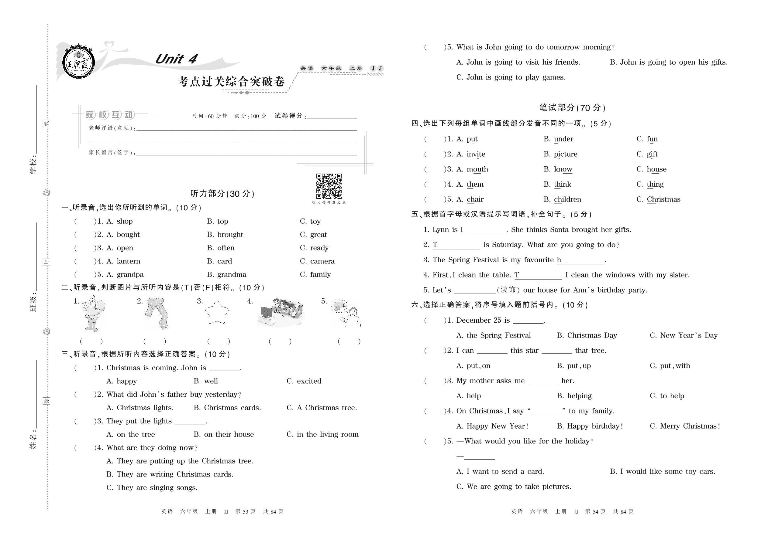 2021上册六年级英语冀教版 Unit 4 考点过关综合突破卷