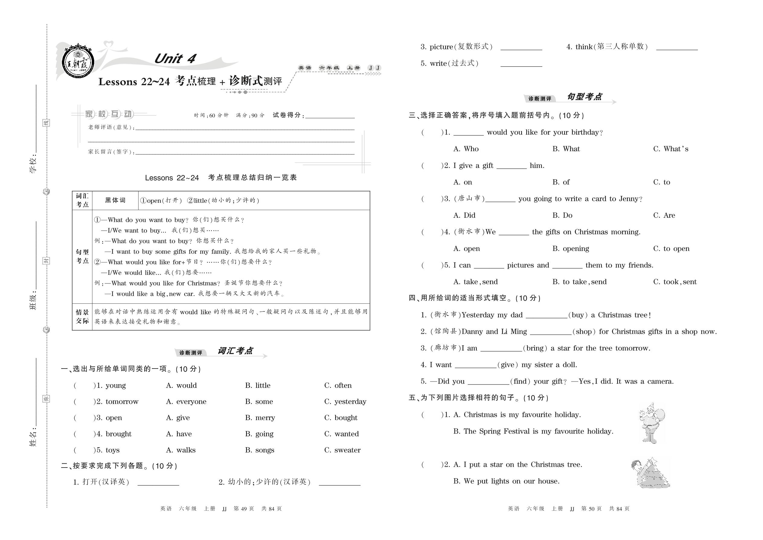 2021上册六年级英语冀教版 Unit 4 Lessons 22~24 考点梳理 + 诊断式测评