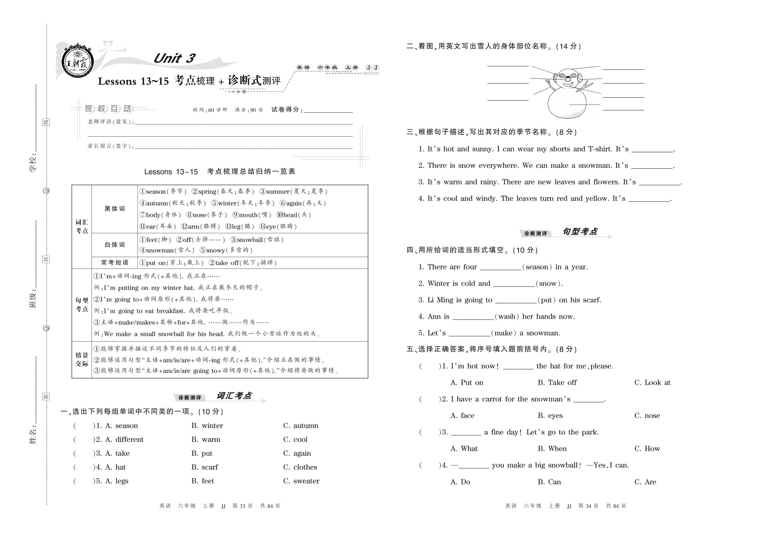 2021上册六年级英语冀教版 Unit 3 Lessons 13~15 考点梳理 + 诊断式测评