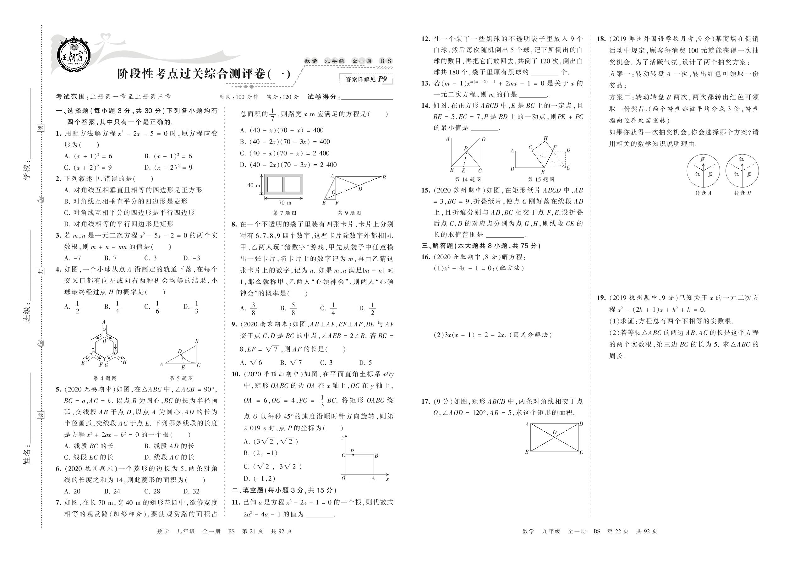 2021秋上册九年级数学北师版 阶段性考点过关综合测评卷(一)