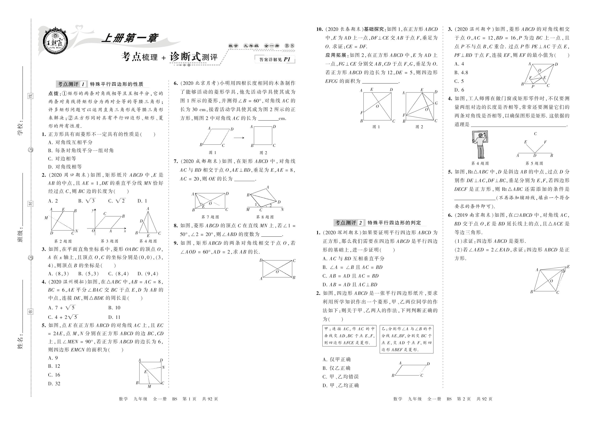 2021秋上册九年级数学北师版 第一章 考点梳理 + 诊断式测评