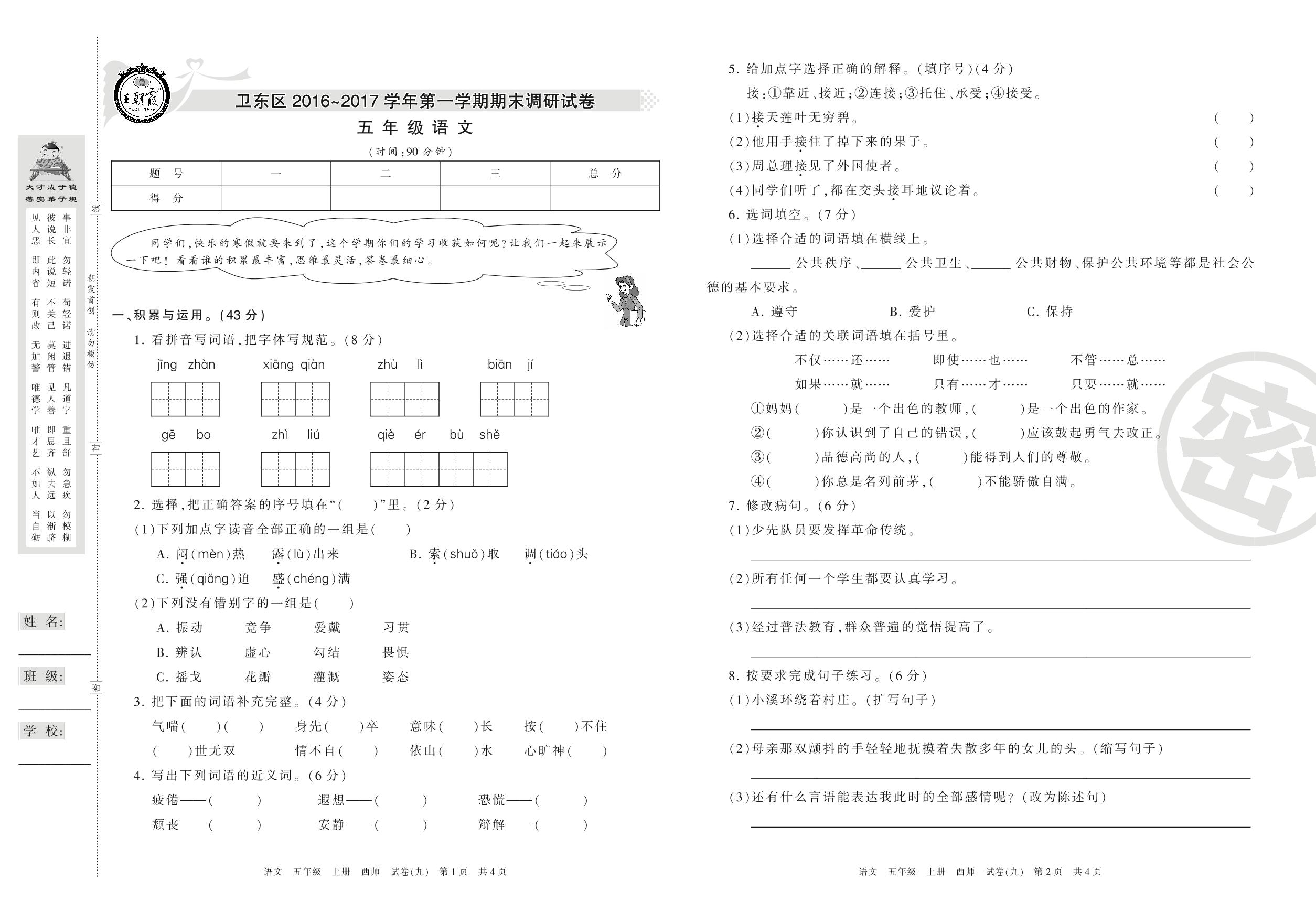 2016-2017学年第一学期平顶山市卫东区五年级语文试卷(西师版)【9】