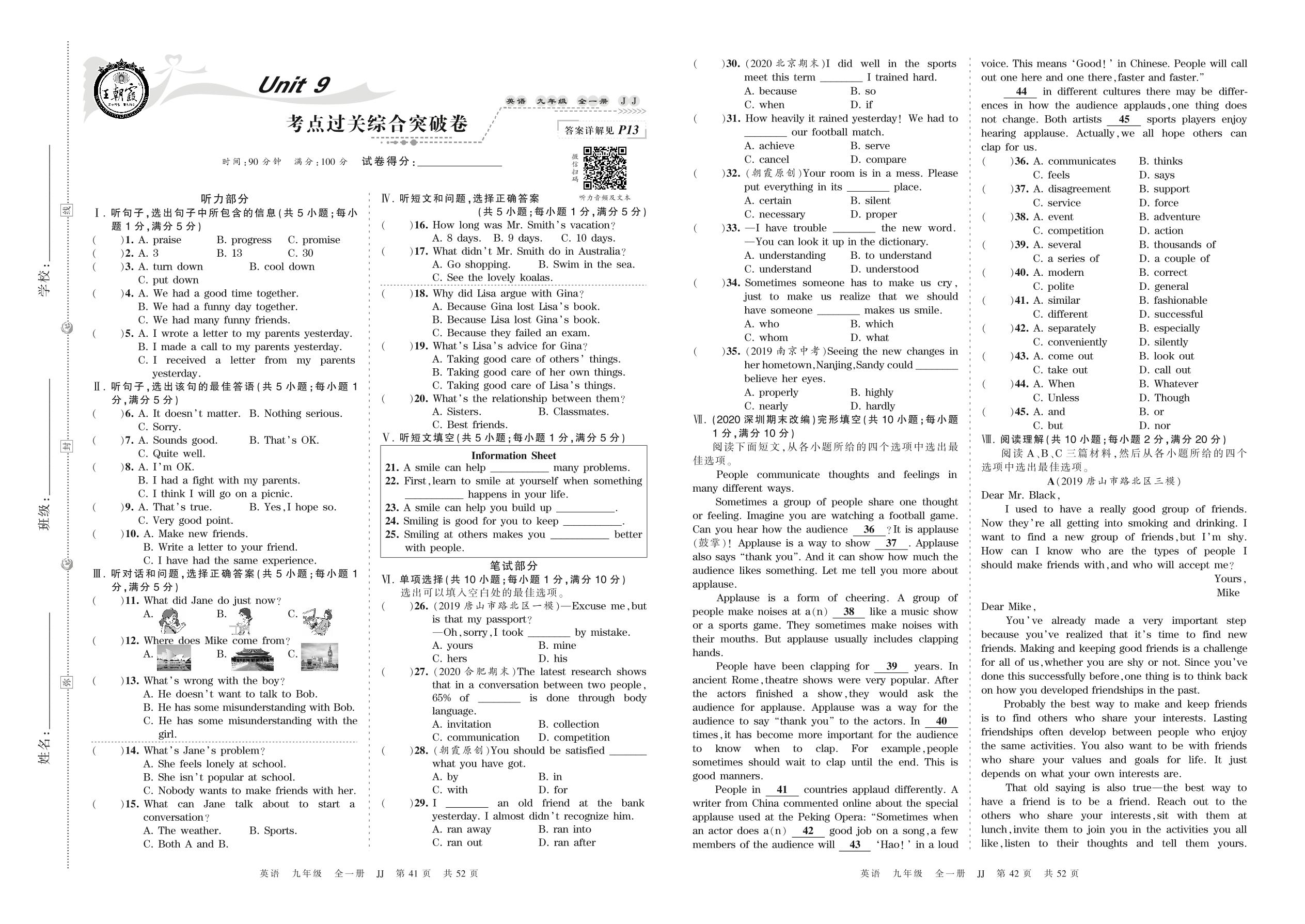2021-2022学年九年级英语冀教版 Unit 9 考点过关综合突破卷