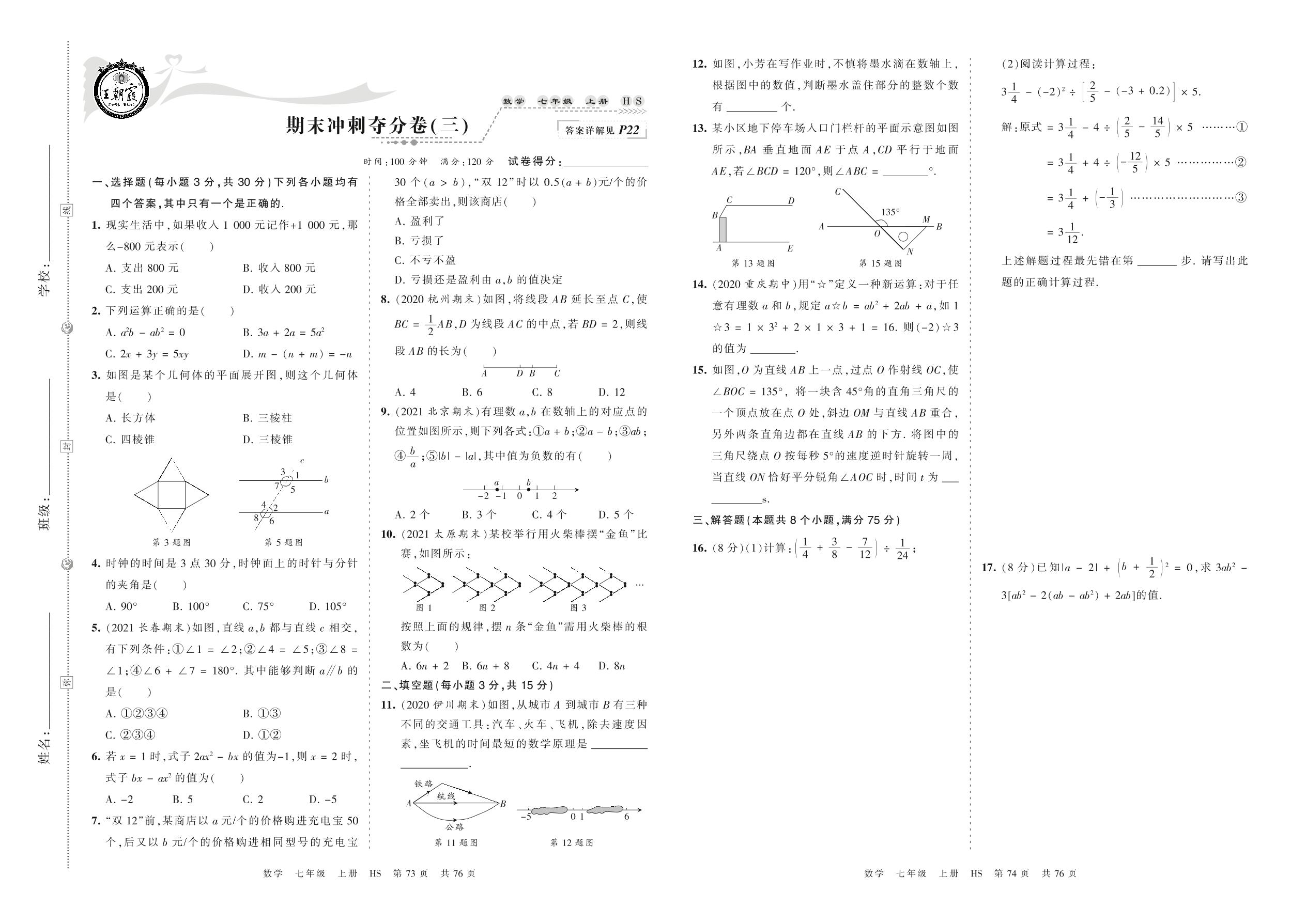 2021上册七年级数学华师版 期末冲刺夺分卷(三)