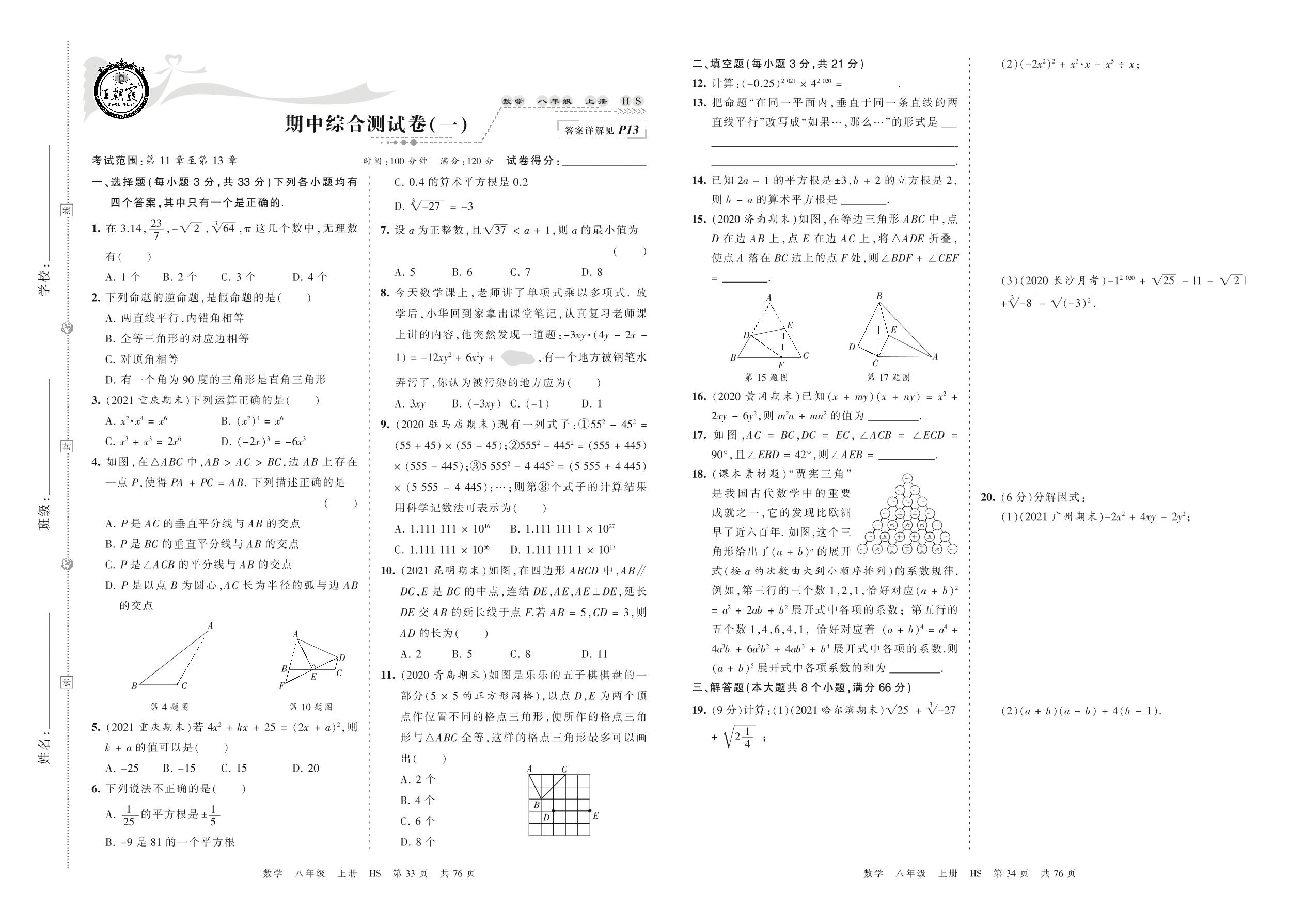 2021上册八年级数学华师版 期中综合测试卷(一)