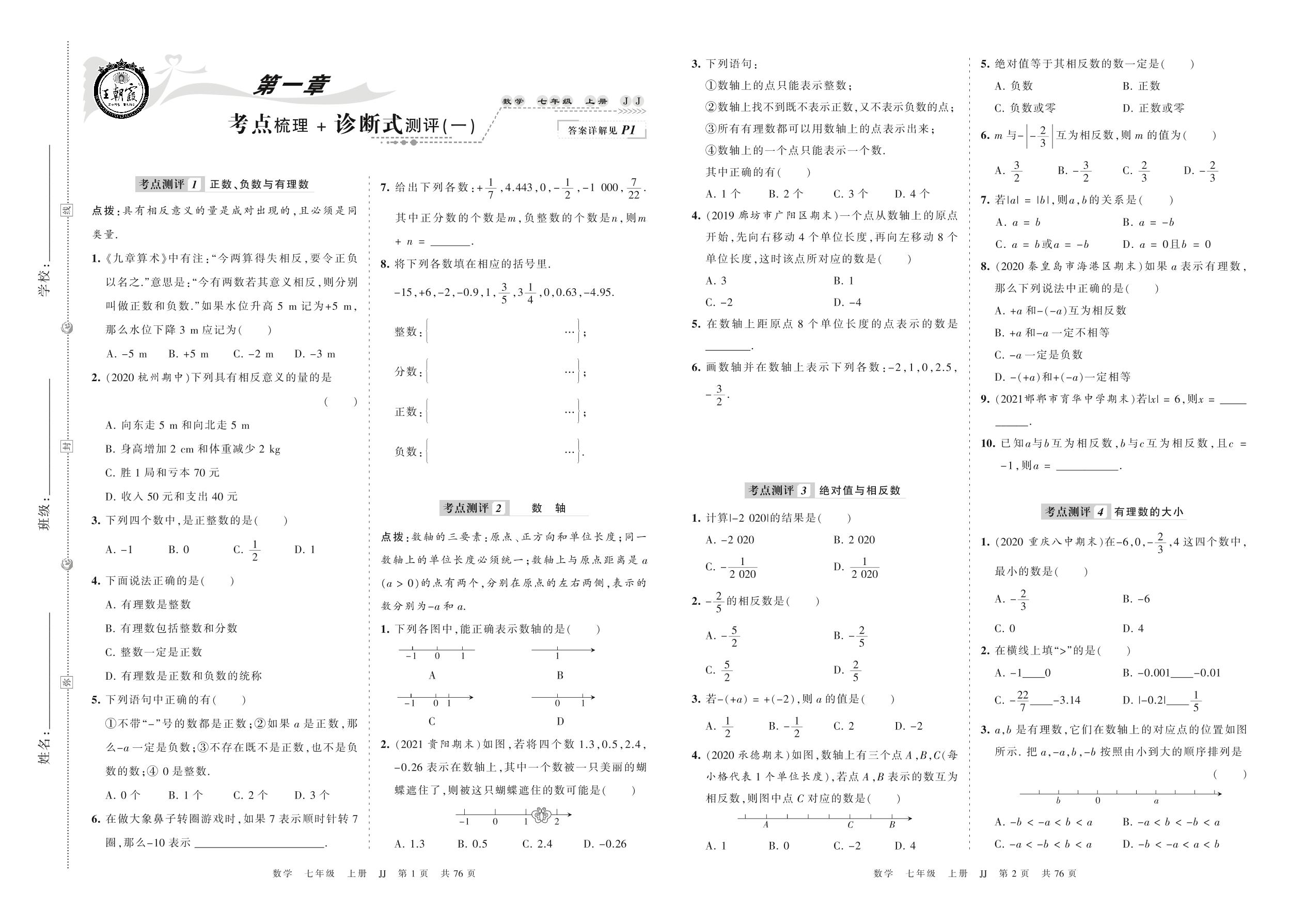 2021上册七年级数学冀教版 第一章 考点梳理+诊断式测评(一)
