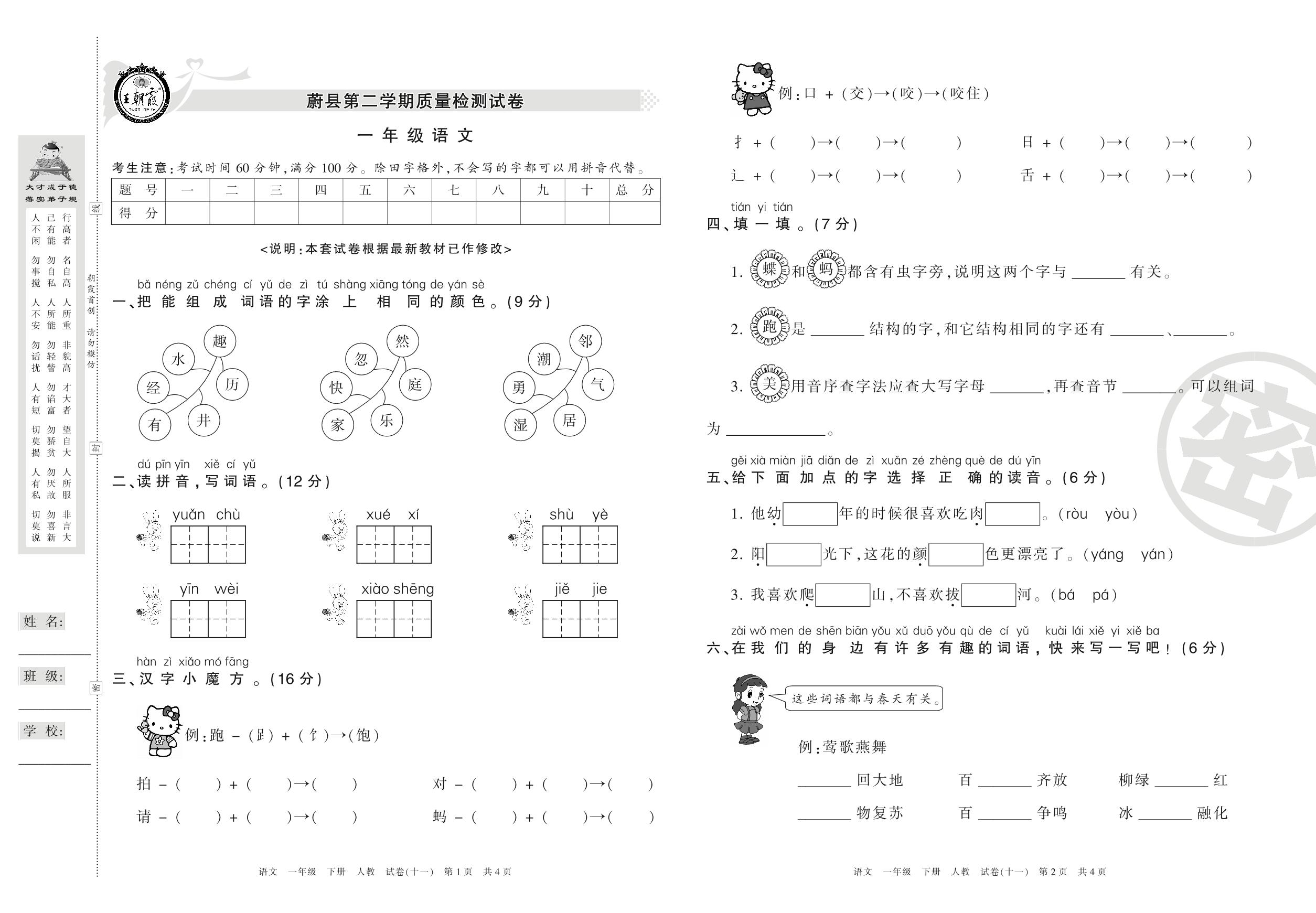 一年级语文人教版下册期末卷