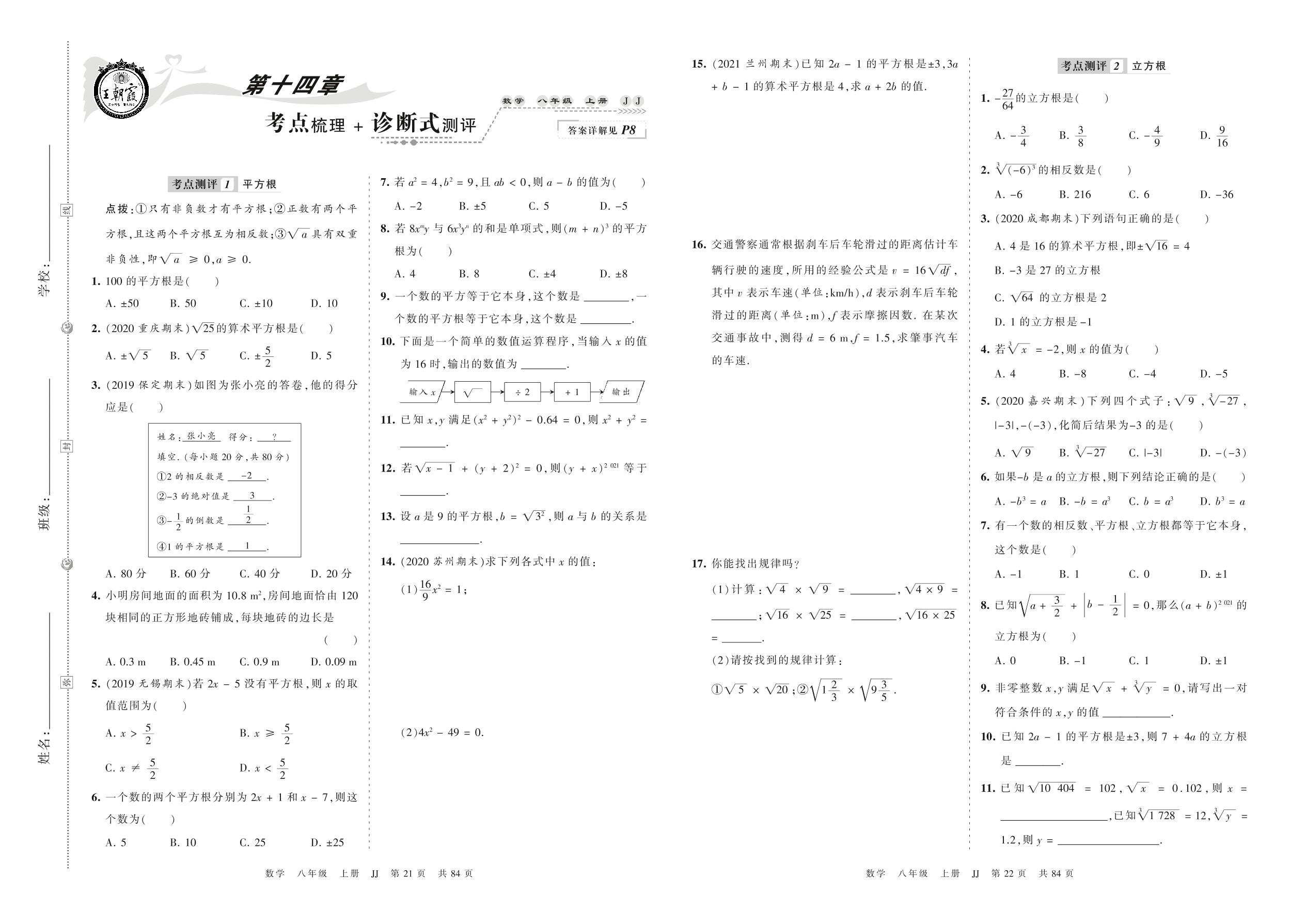 2021上册八年级数学冀教版 第十四章 考点梳理+诊断式测评