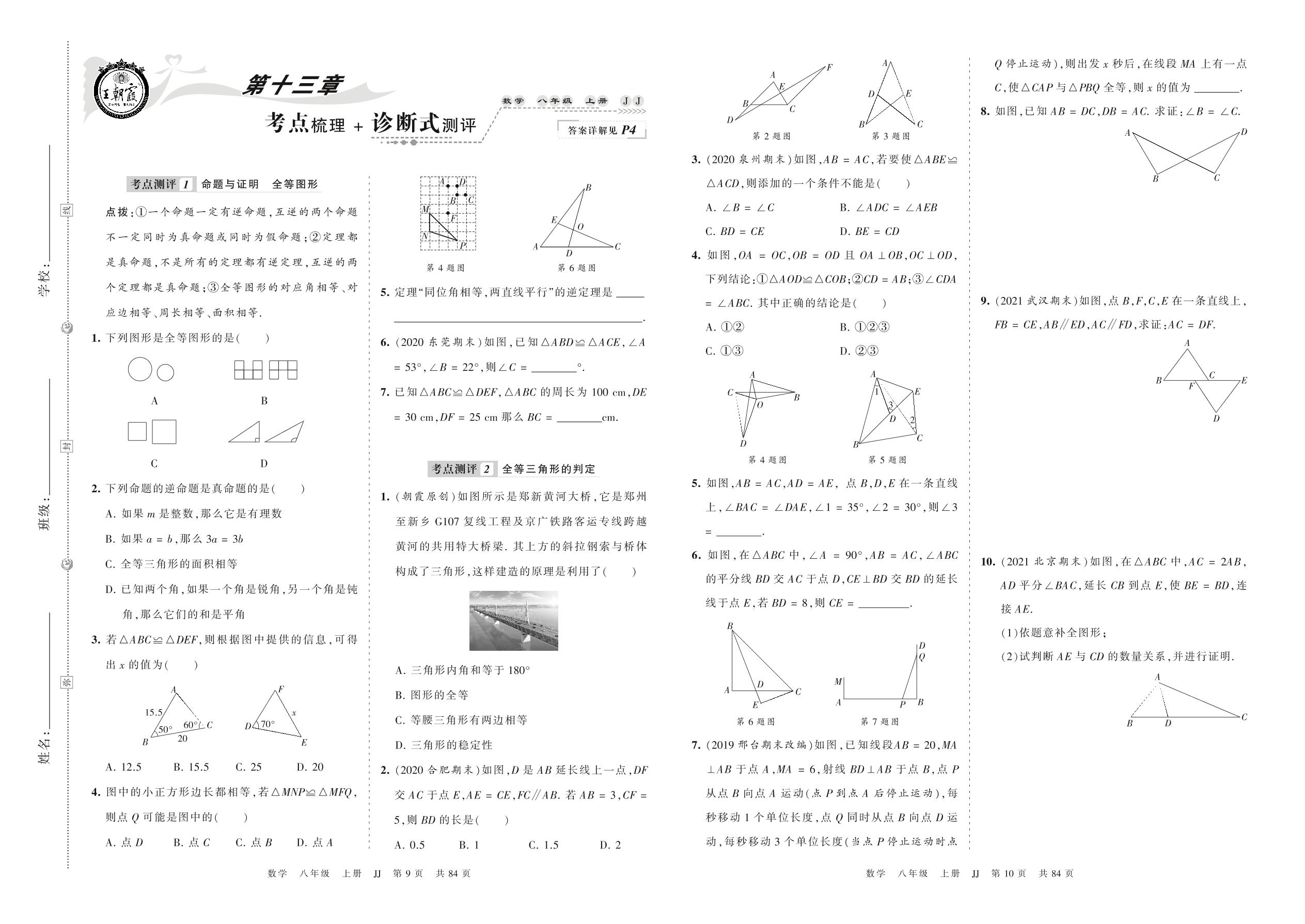 2021上册八年级数学冀教版 第十三章 考点梳理+诊断式测评