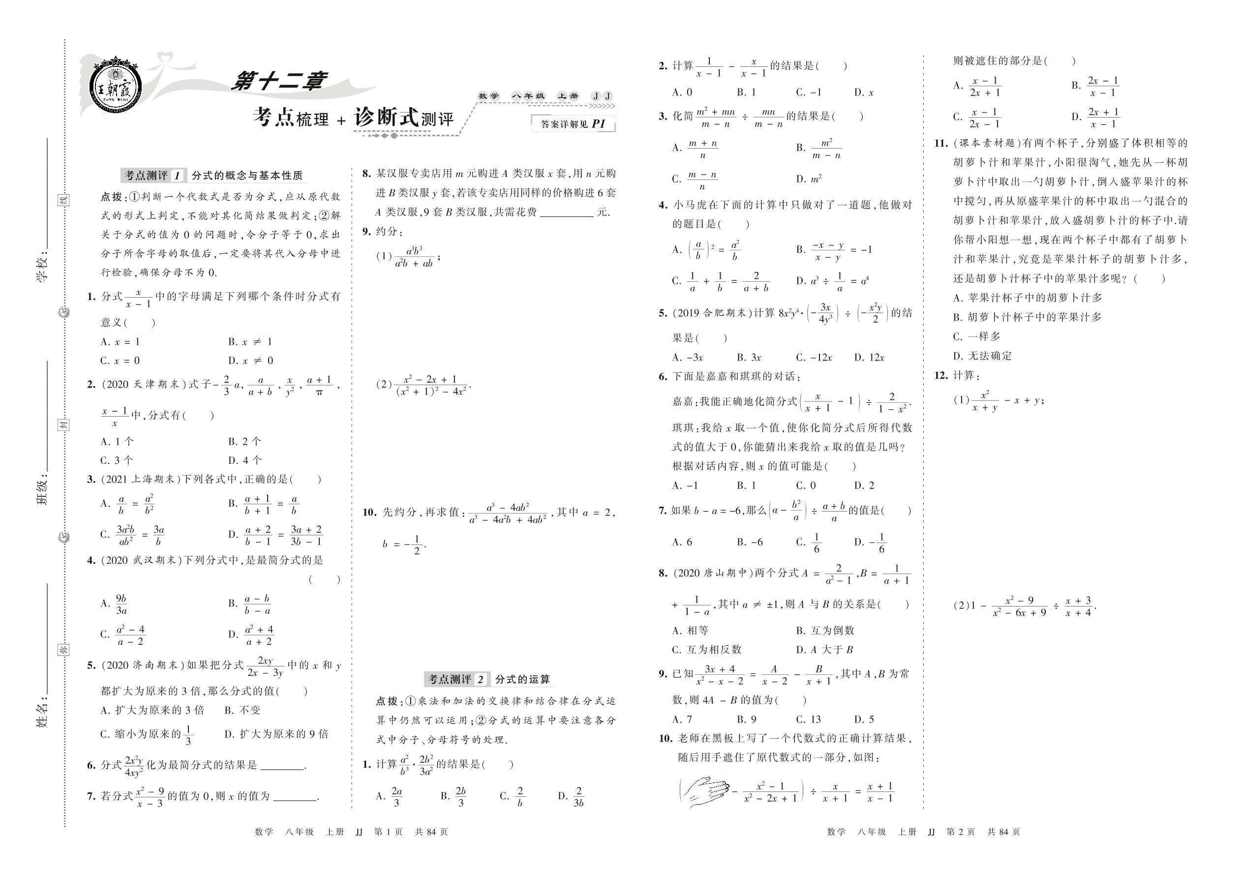 2021上册八年级数学冀教版 第十二章 考点梳理+诊断式测评
