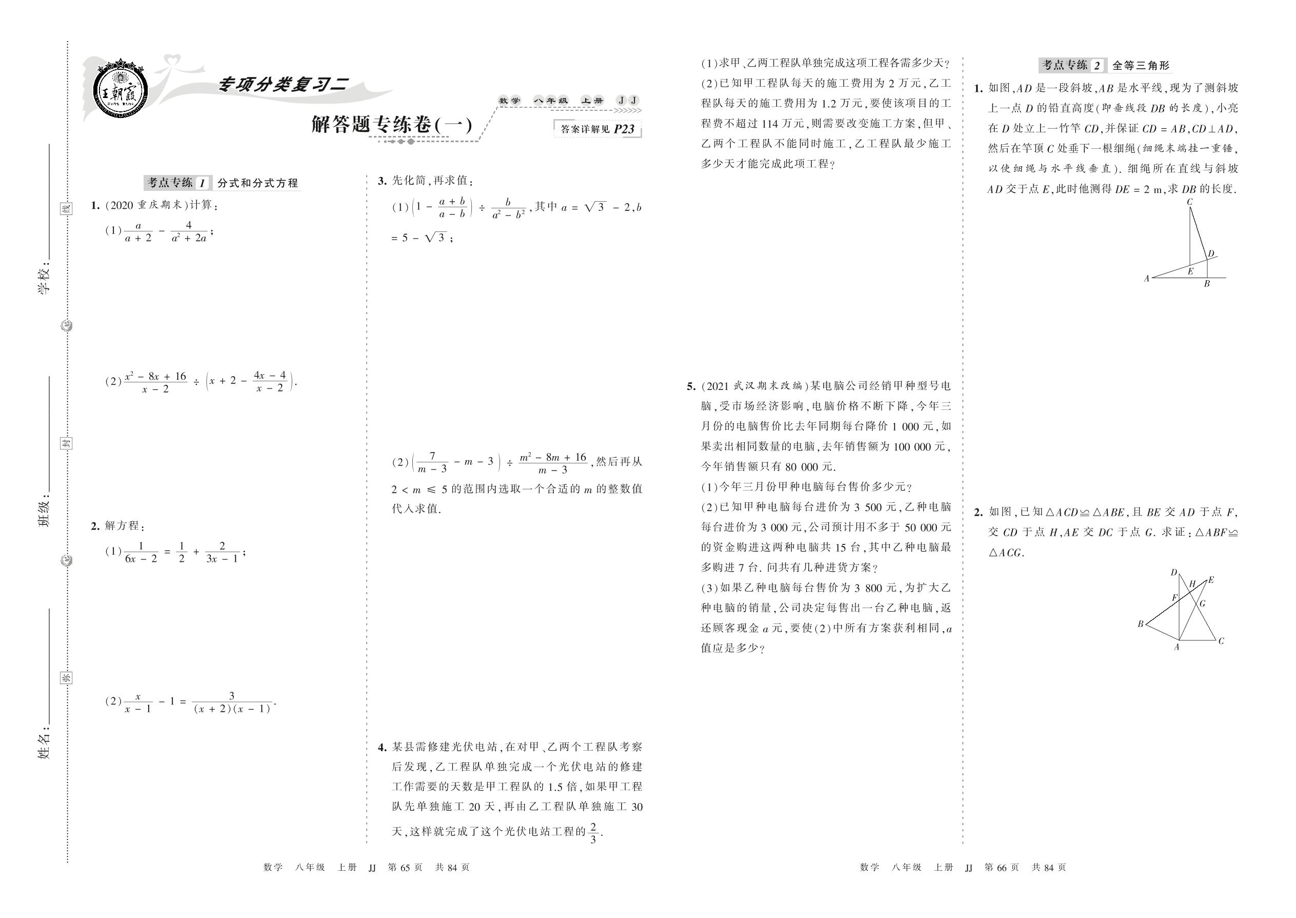 2021上册八年级数学冀教版 解答题专练卷(一)
