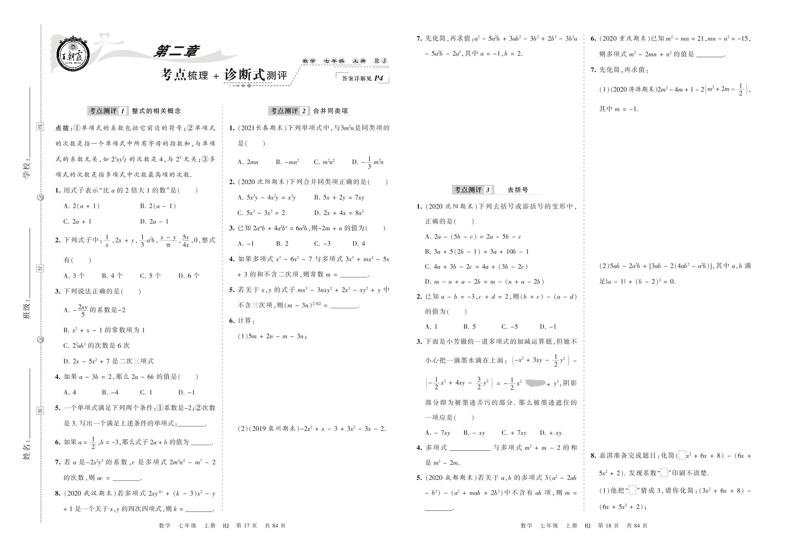 2021上册七年级数学人教版 第二章 考点梳理+诊断式测评