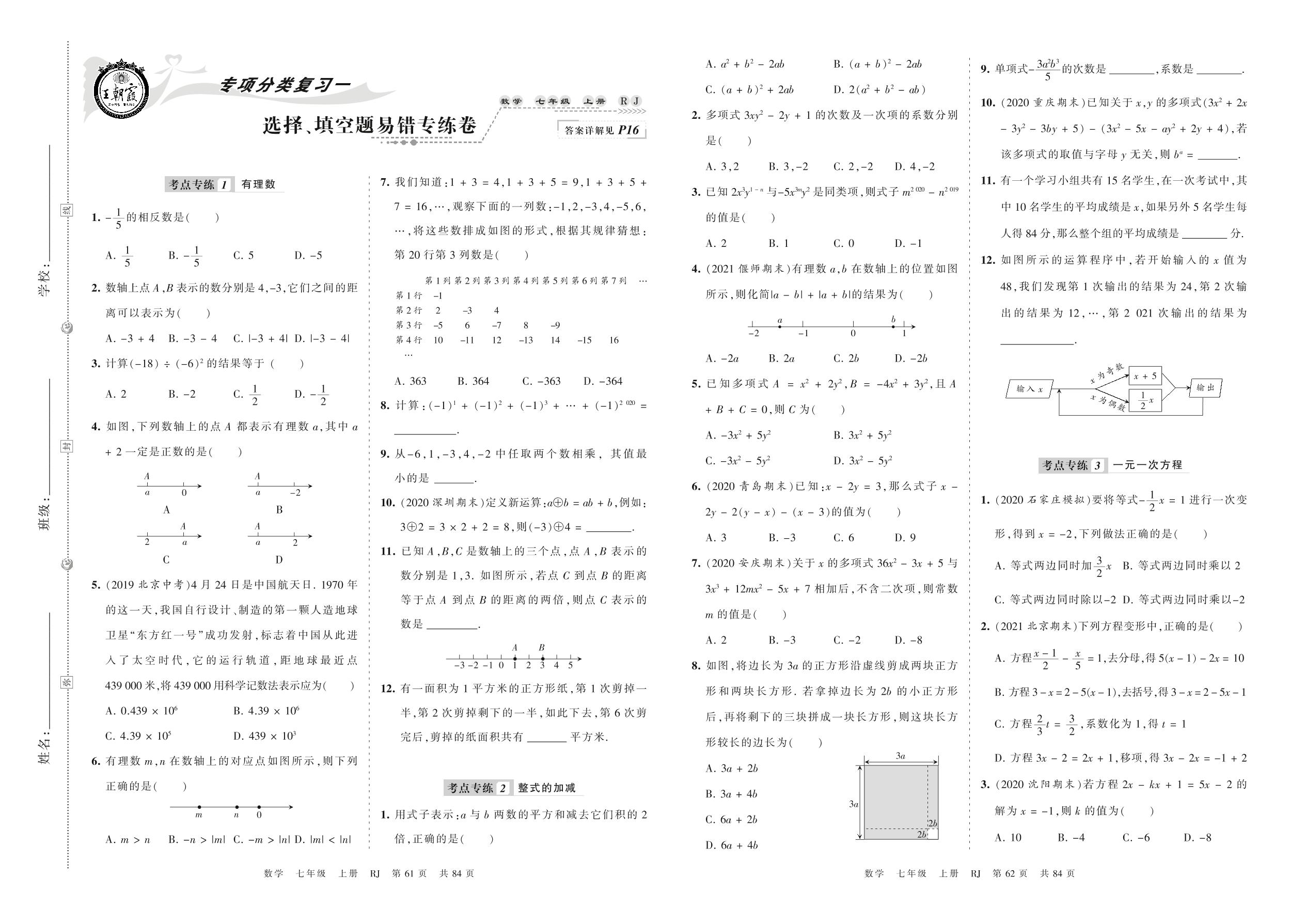 2021上册七年级数学人教版 选择、填空题易错专练卷