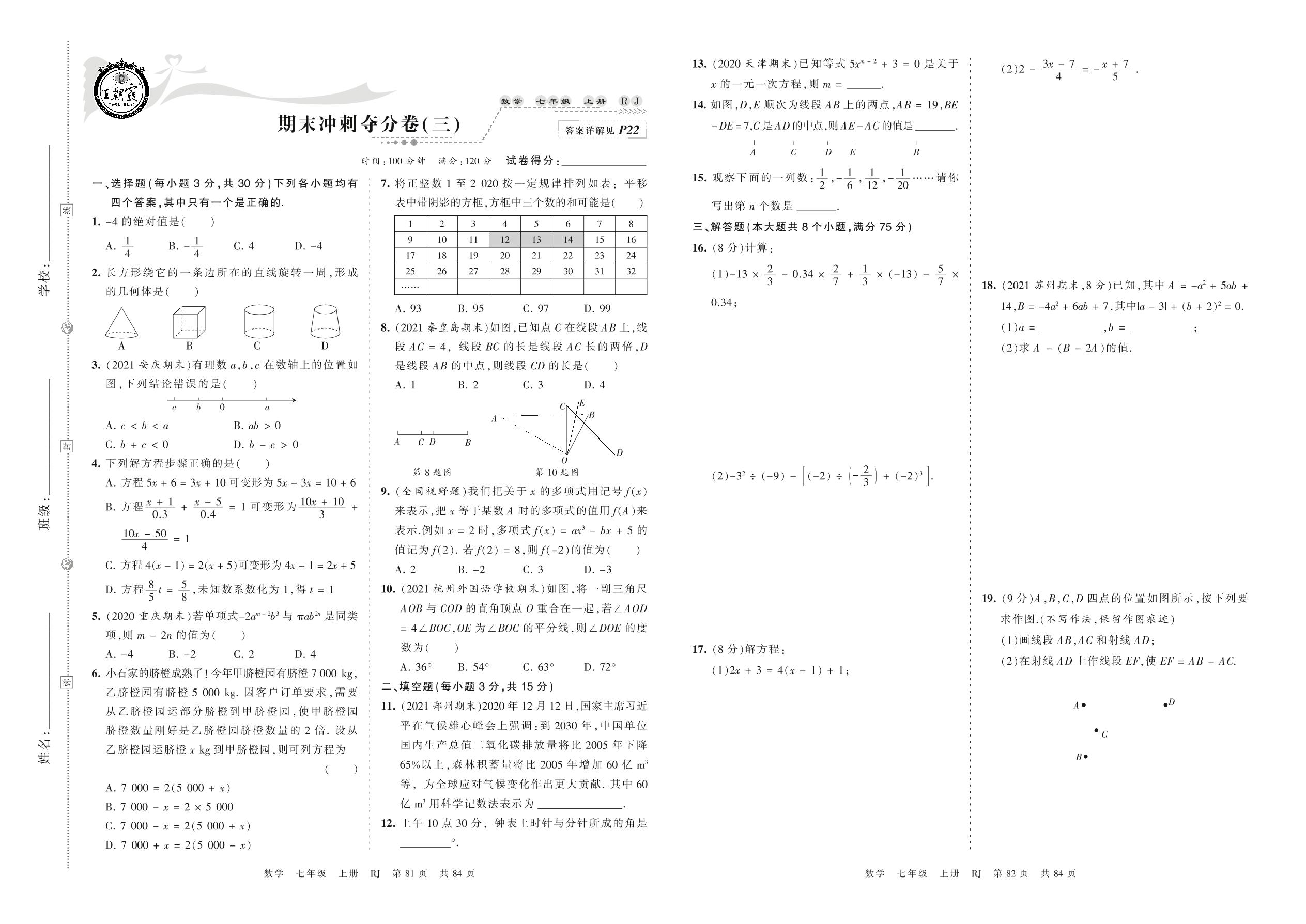 2021上册七年级数学人教版 期末冲刺夺分卷(三)