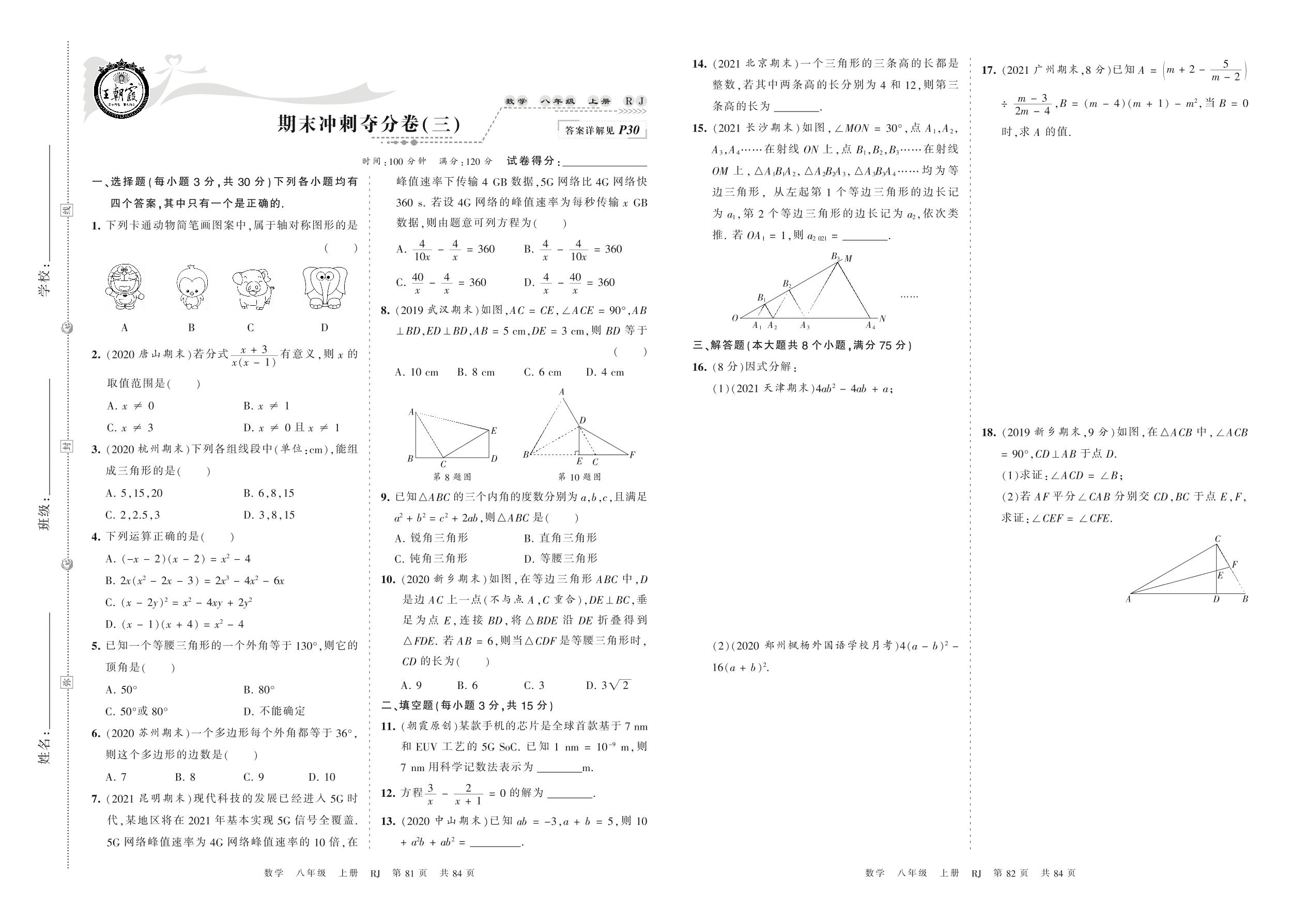 2021上册八年级数学人教版 期末冲刺夺分卷(三)
