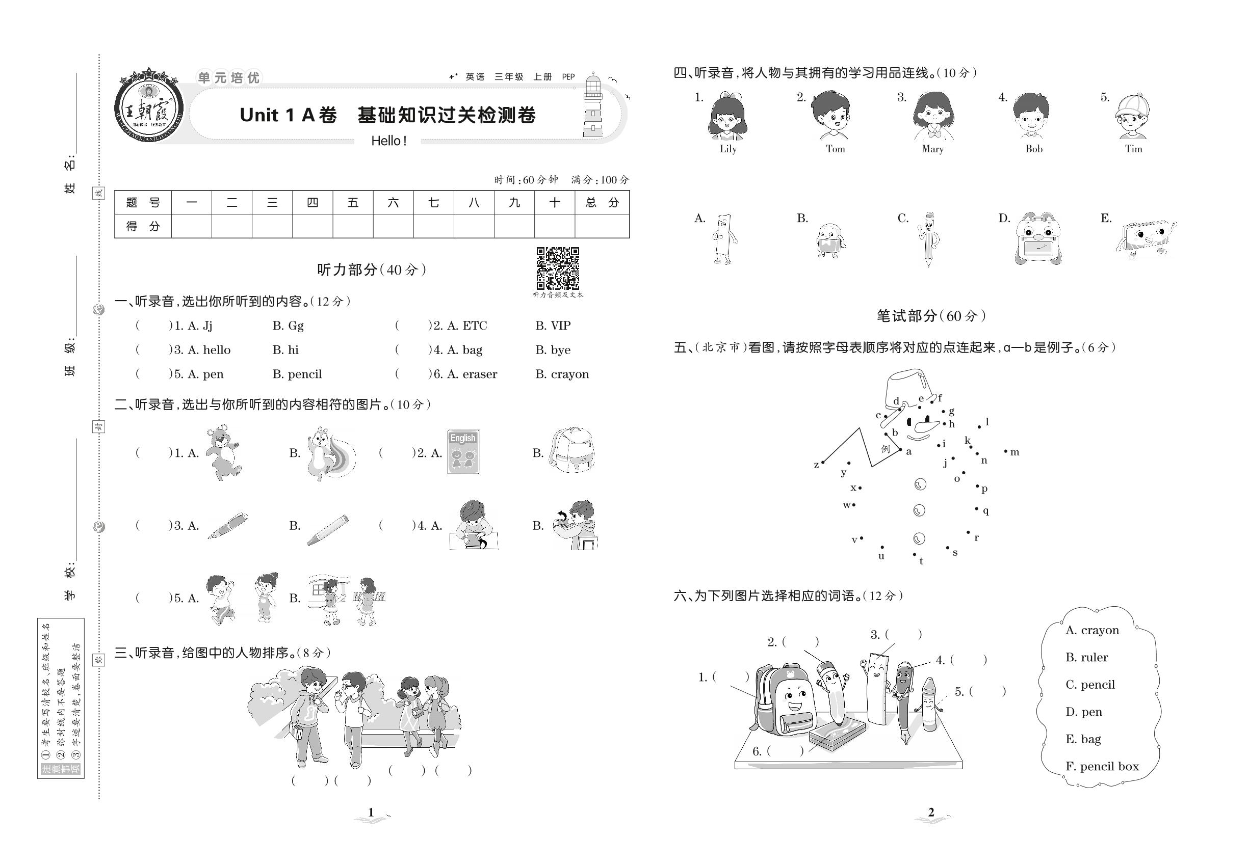 2021上册三年级英语人教PEP版 Unit 1 A卷 基础知识过关检测卷