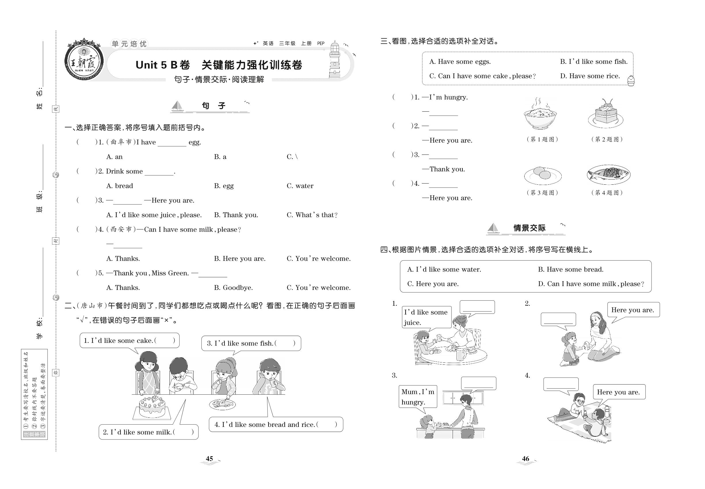 2021上册三年级英语人教PEP版 Unit 5 B卷 关键能力强化训练卷