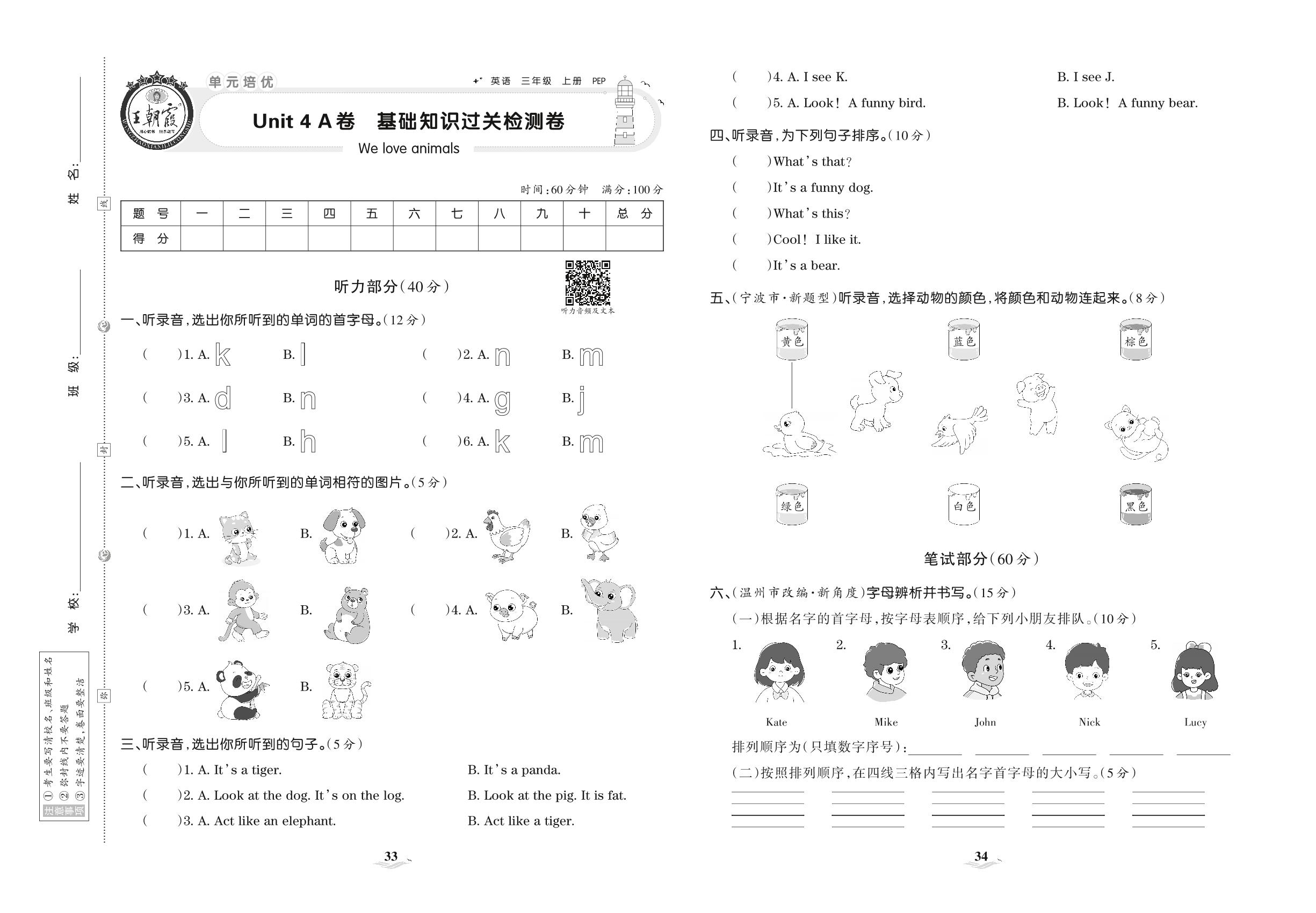 2021上册三年级英语人教PEP版 Unit 4 A卷 基础知识过关检测卷