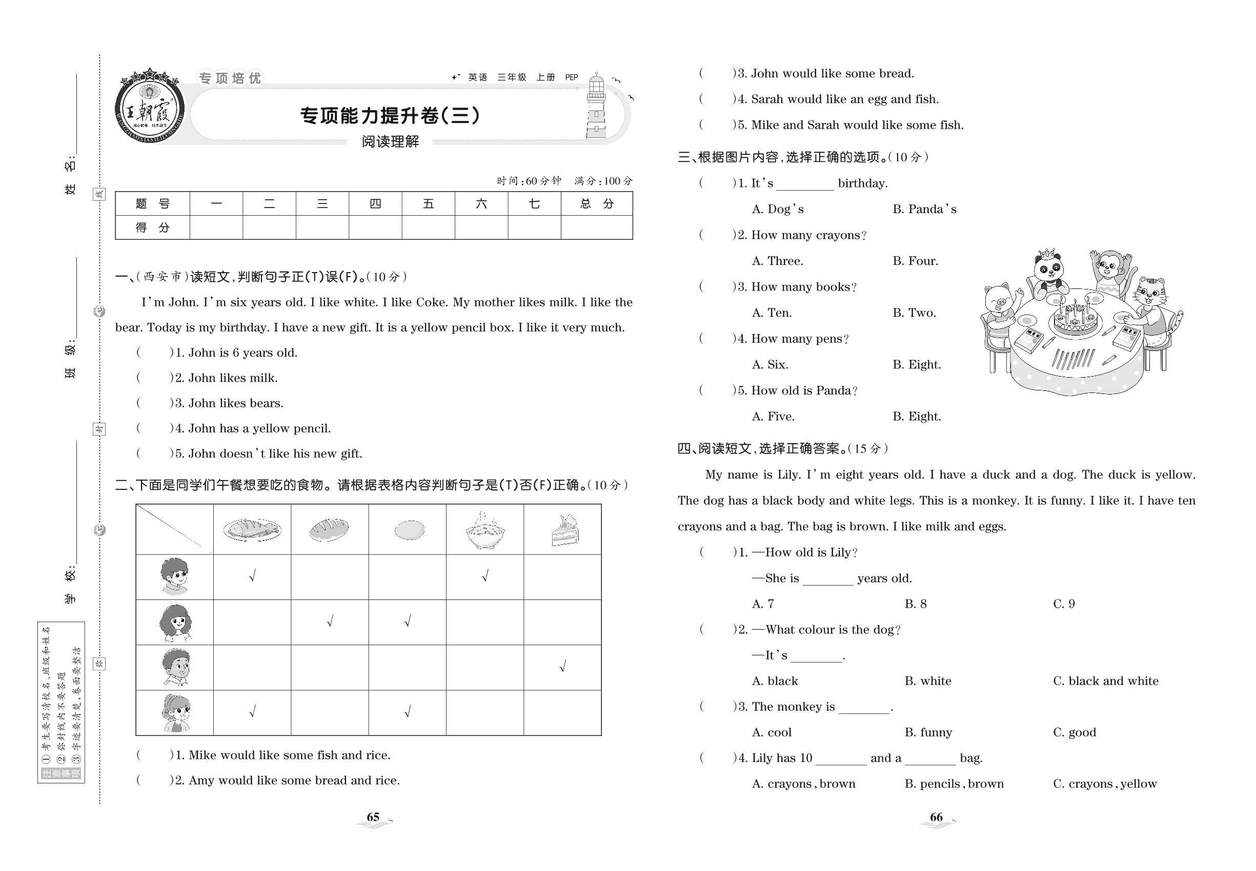 2021上册三年级英语人教PEP版 专项能力提升卷(三) 阅读理解