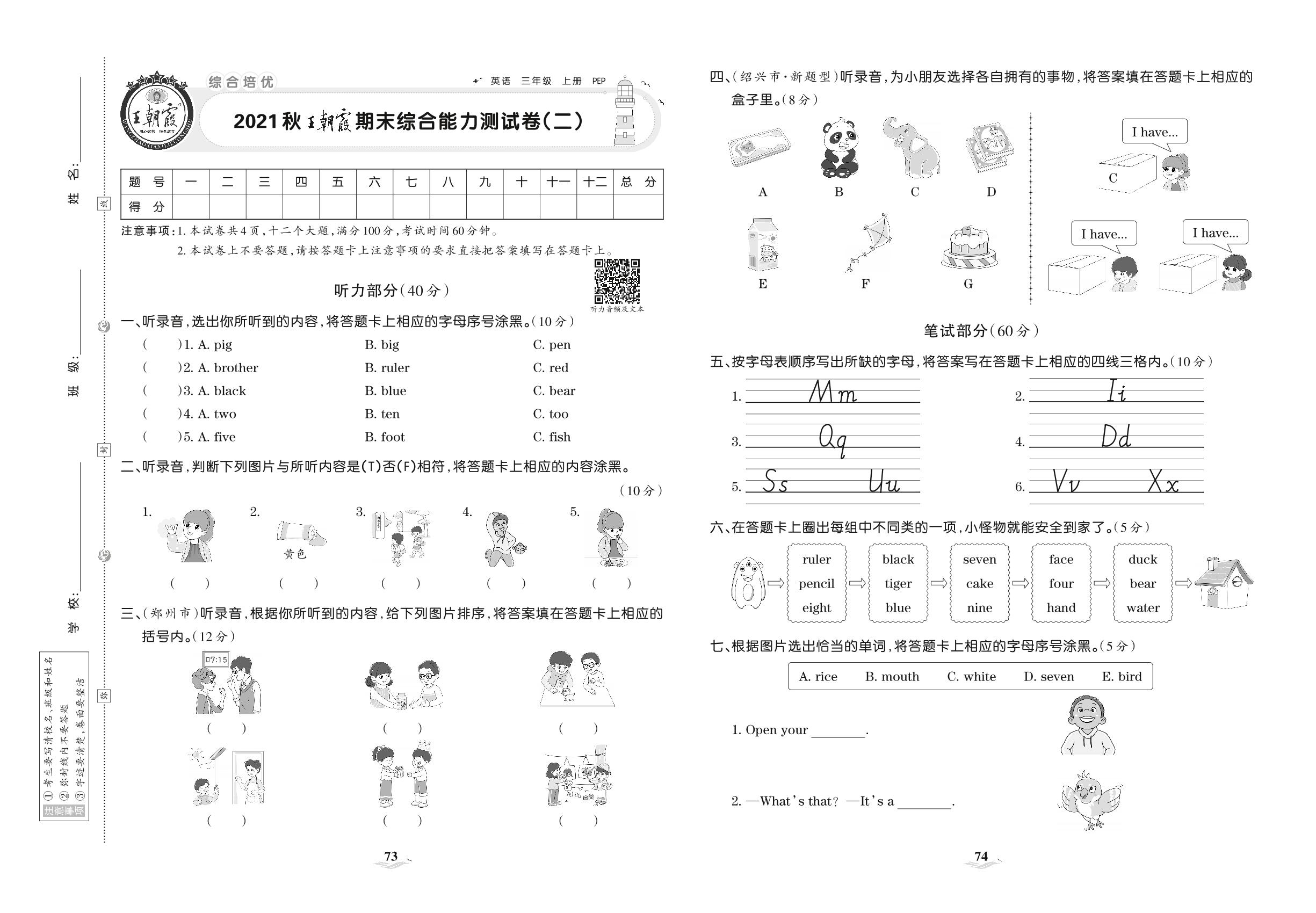 2021上册三年级英语人教PEP版 王朝霞期末综合能力测试卷(二)
