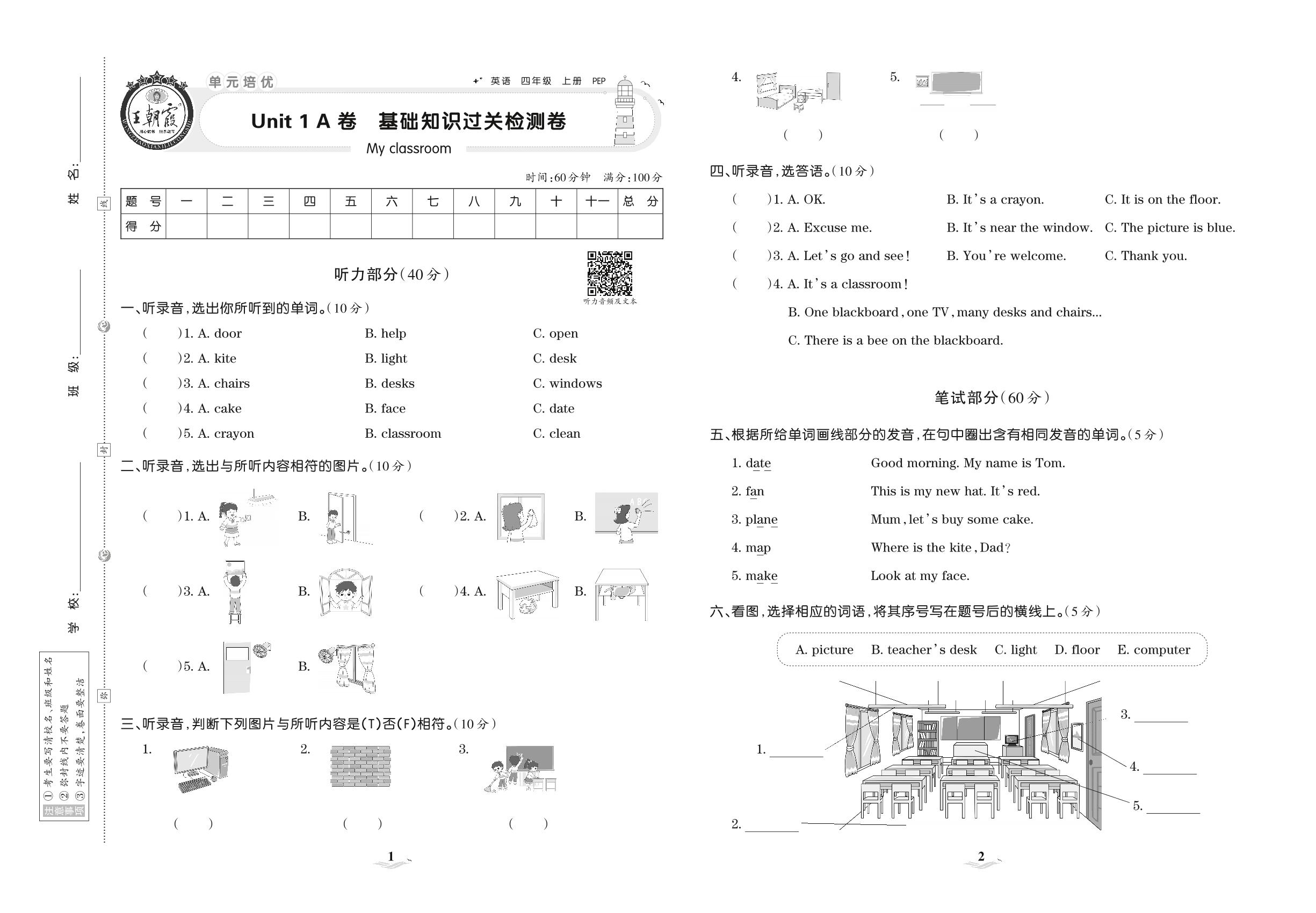 2021上册四年级英语人教PEP版 Unit 1 A卷 基础知识过关检测卷