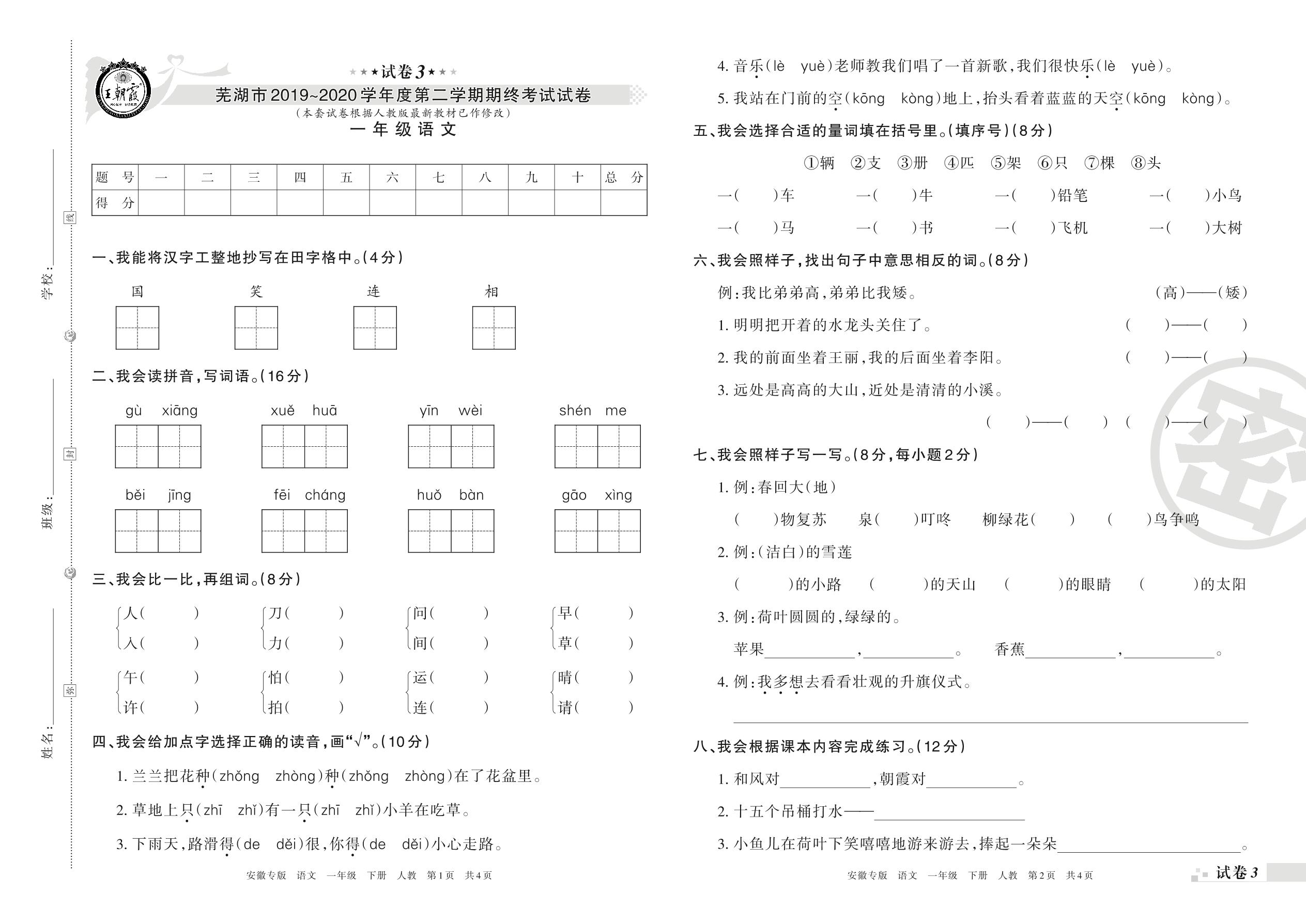 2019-2020学年第二学期芜湖市一年级语文试卷(人教版)【3】