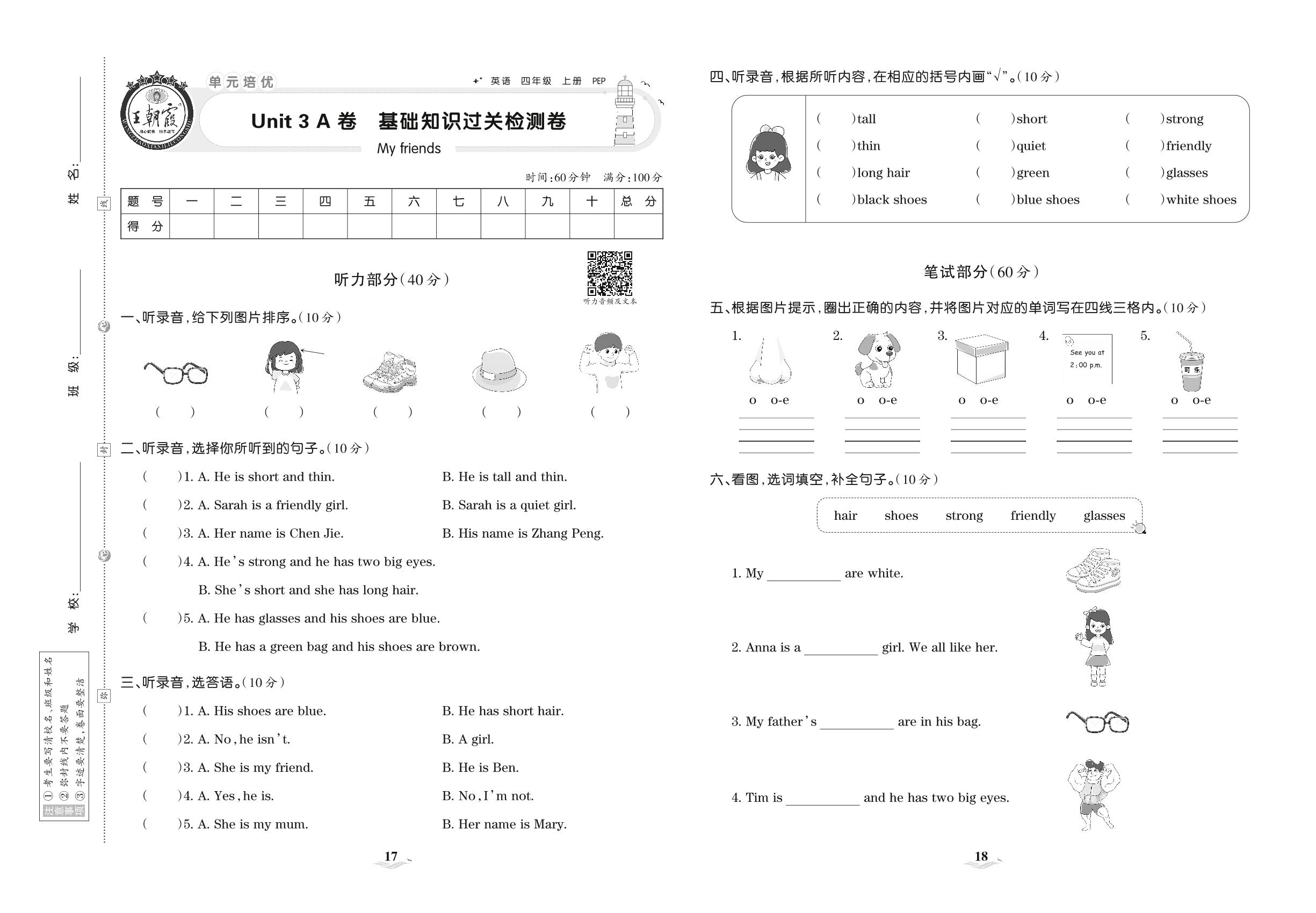 2021上册四年级英语人教PEP版 Unit 3 A卷 基础知识过关检测卷