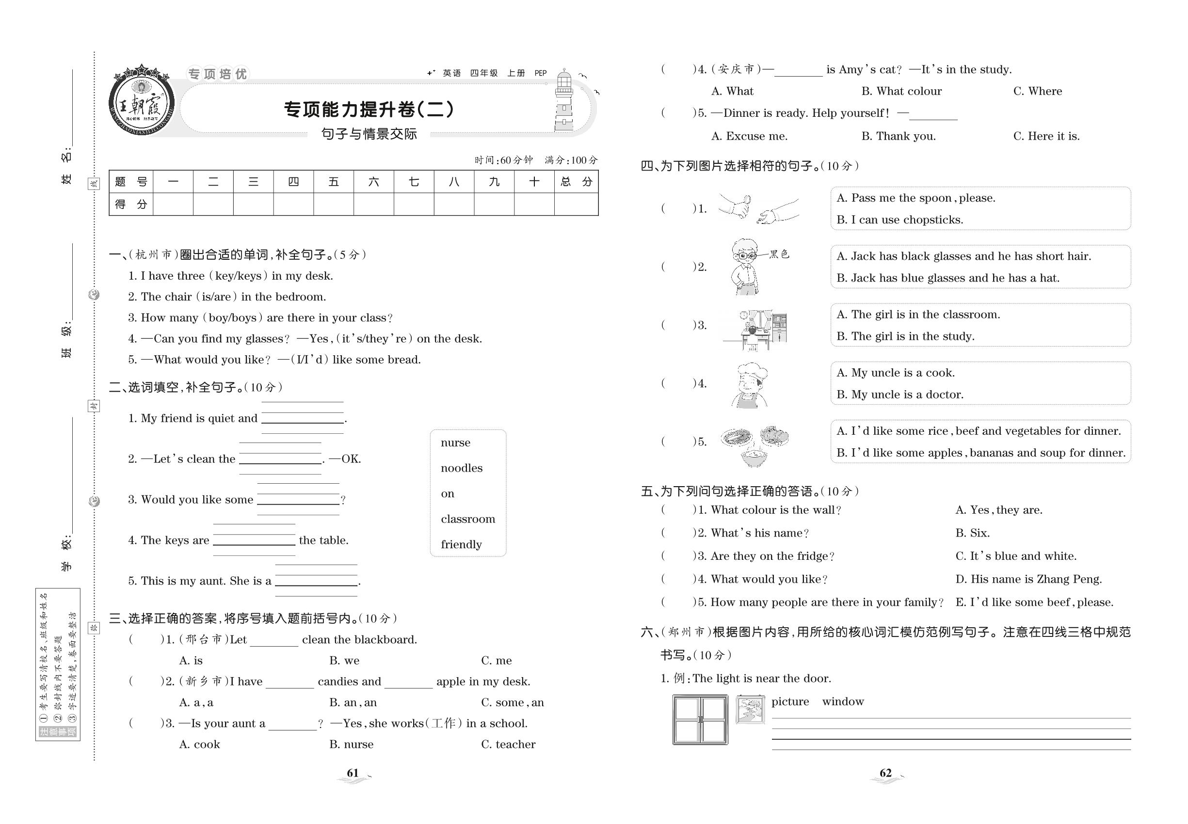 2021上册四年级英语人教PEP版 专项能力提升卷(二) 句子与情景交际
