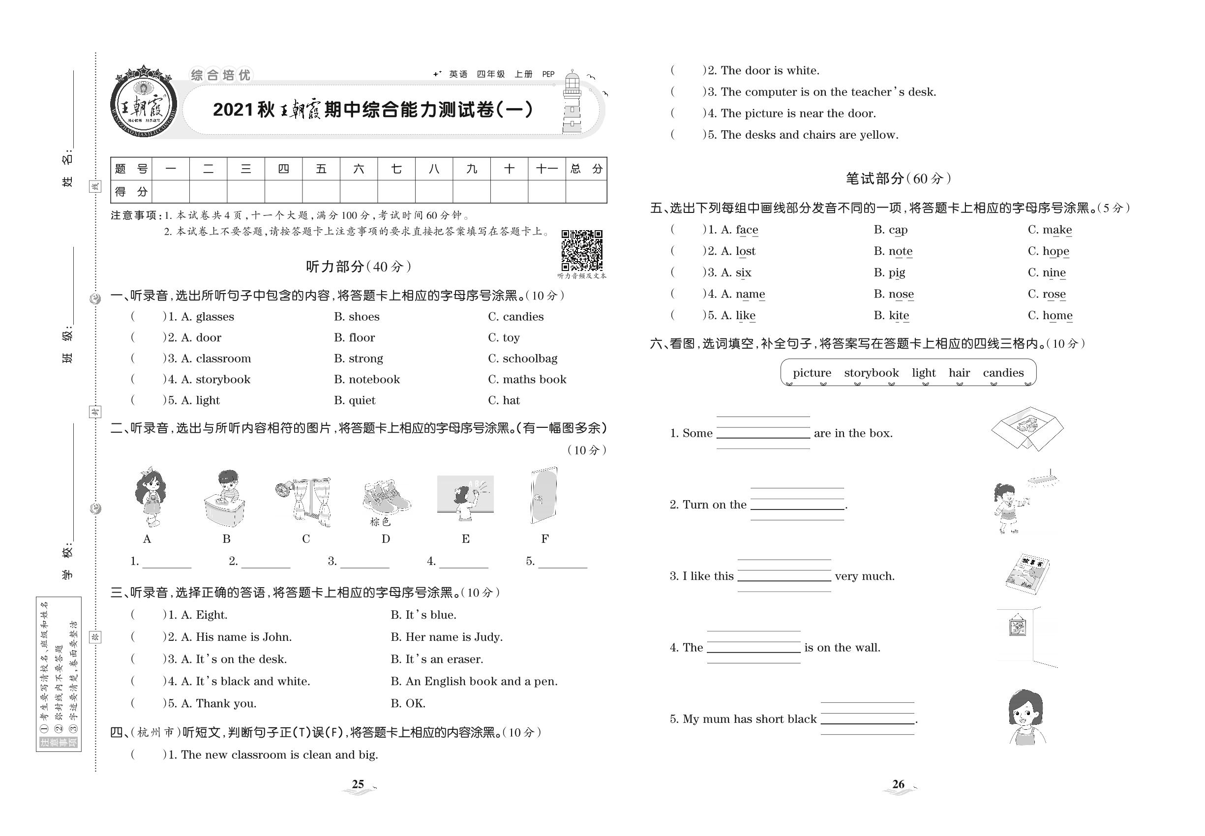2021上册四年级英语人教PEP版 王朝霞期中综合能力测试卷(一)