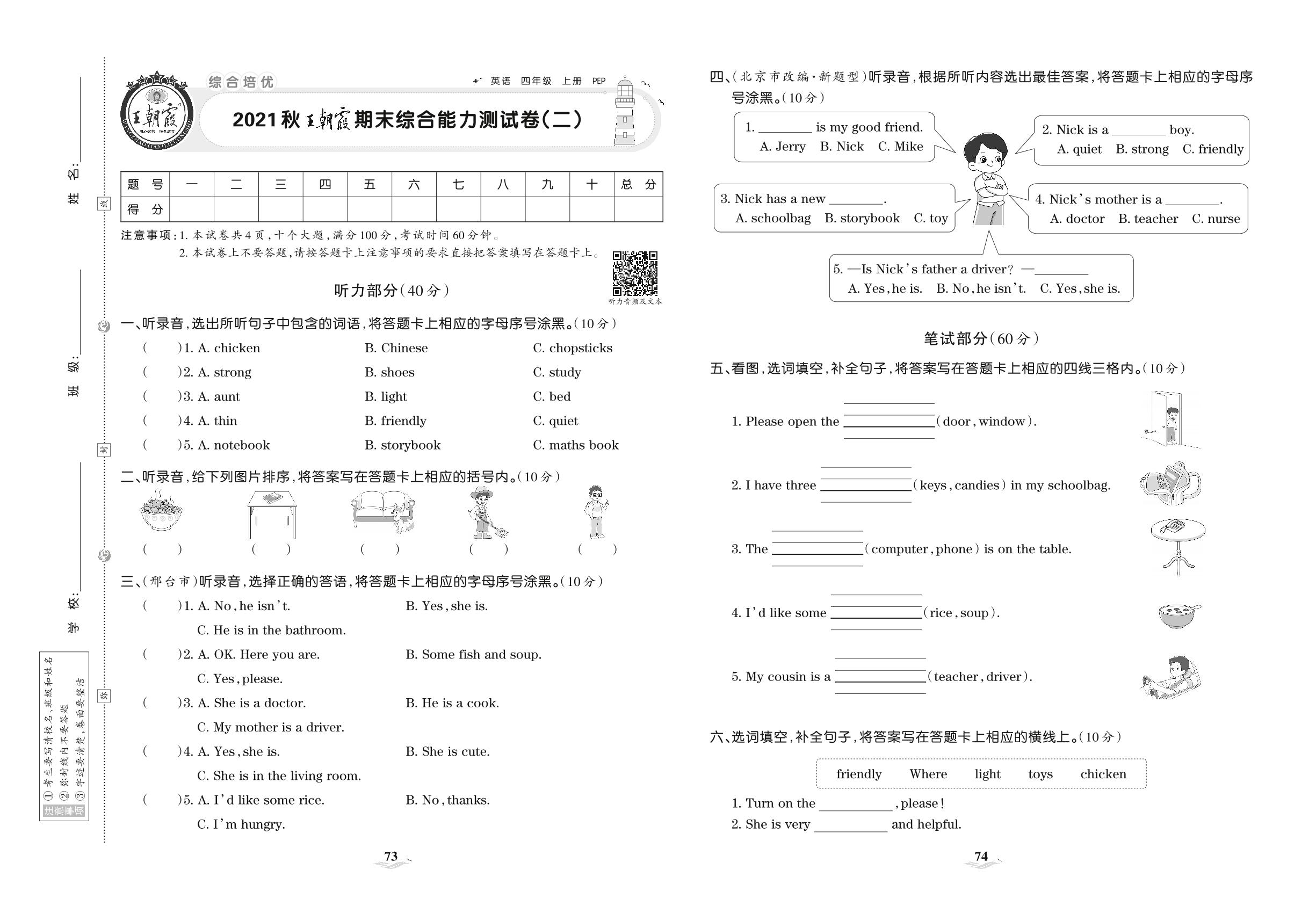 2021上册四年级英语人教PEP版 王朝霞期末综合能力测试卷(二)