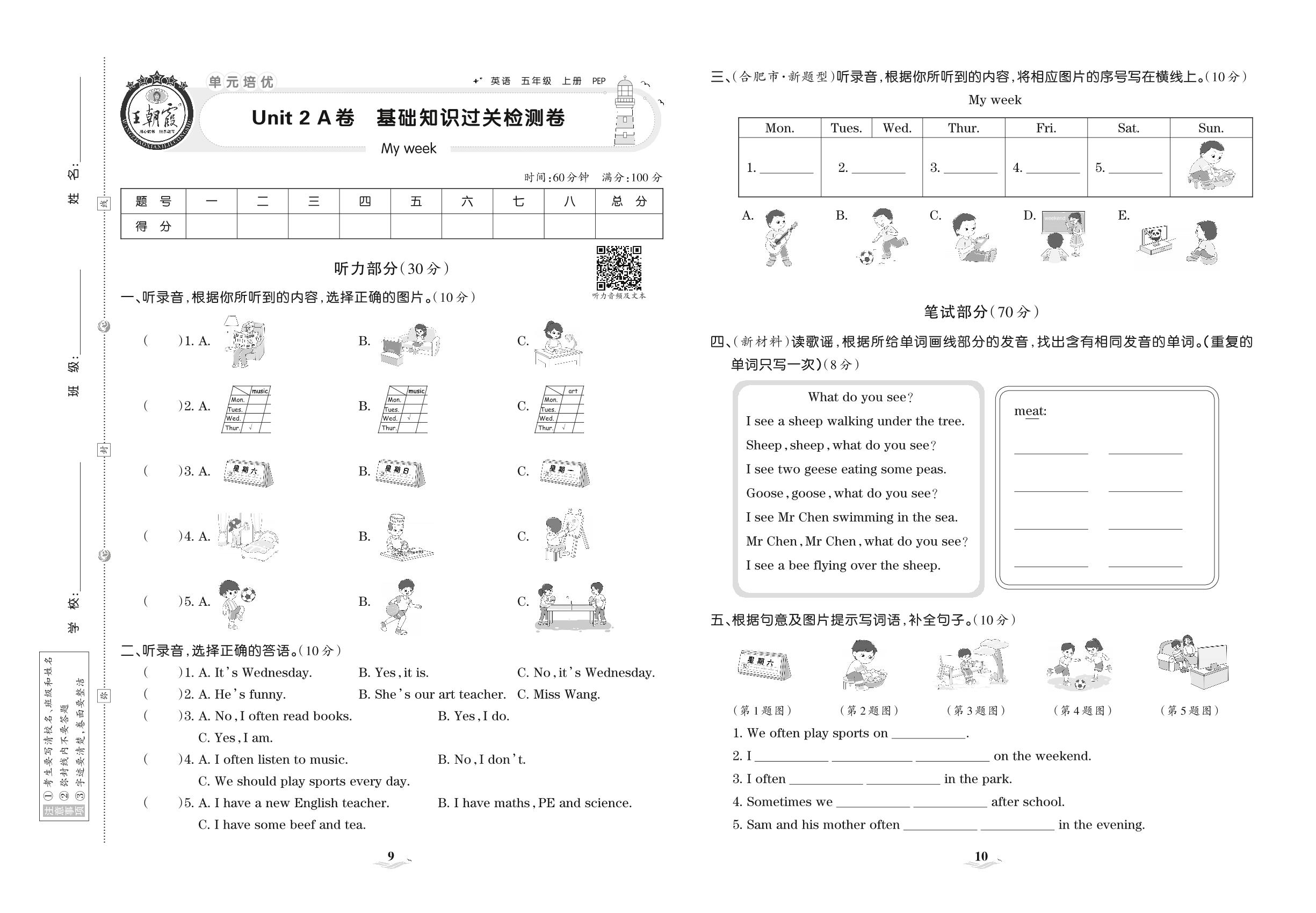 2021上册五年级英语人教PEP版 Unit 2 A卷 基础知识过关检测卷