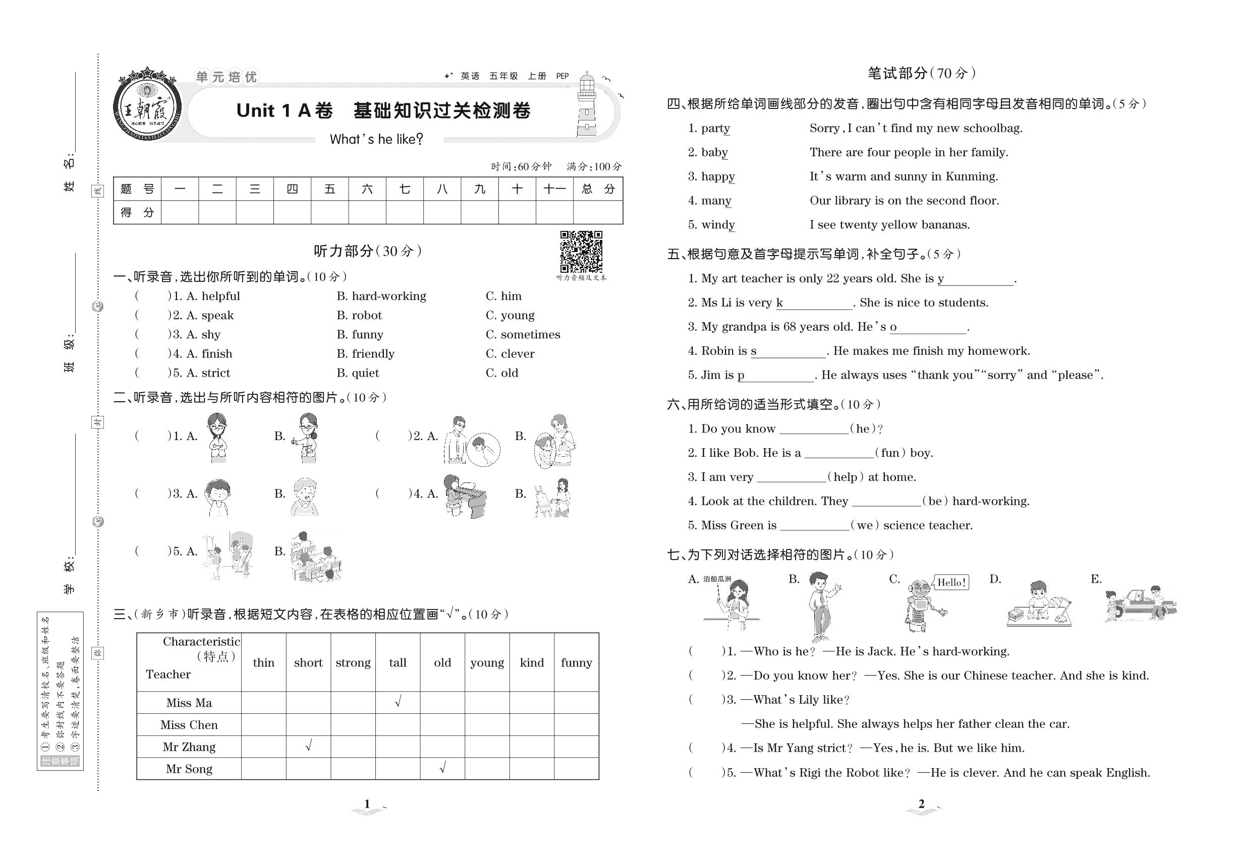 2021上册五年级英语人教PEP版 Unit 1 A卷 基础知识过关检测卷