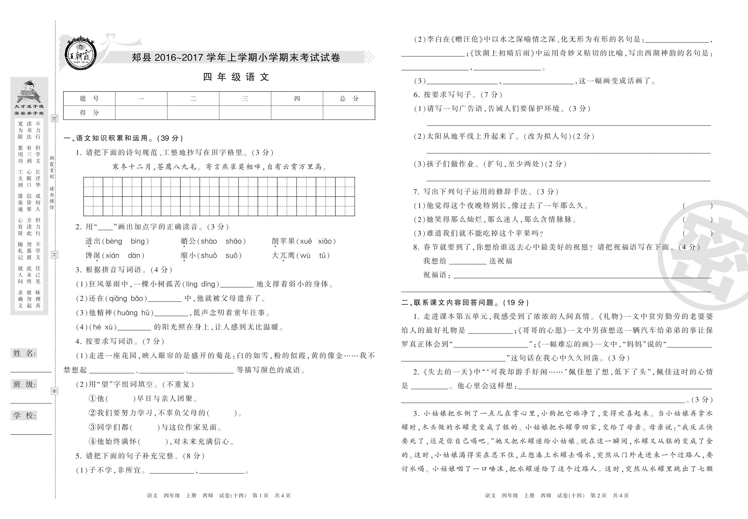 2016-2017学年第一学期平顶山市郏县四年级语文试卷(西师版)【14】