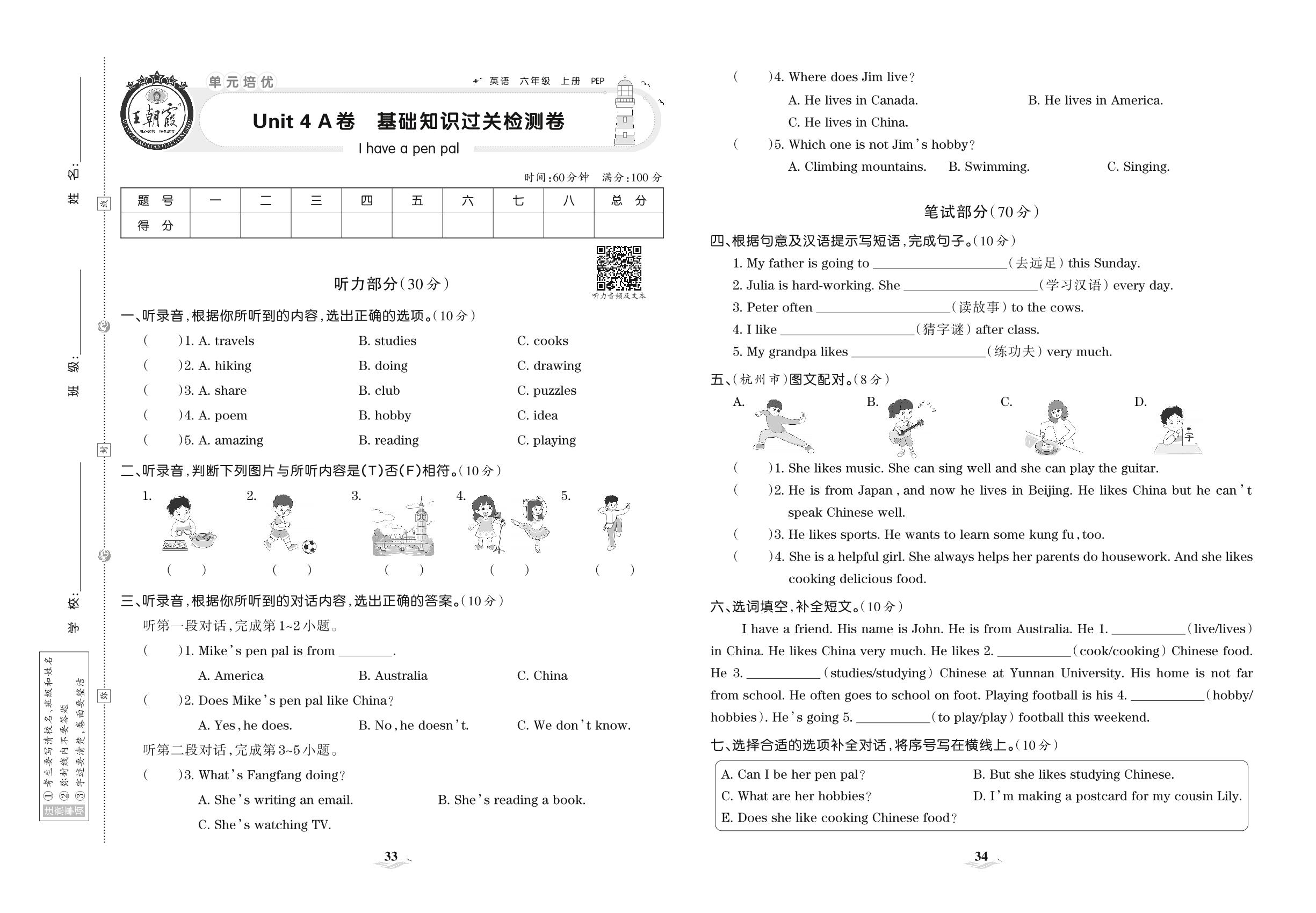 2021上册六年级英语人教PEP版 Unit 4 A卷 基础知识过关检测卷
