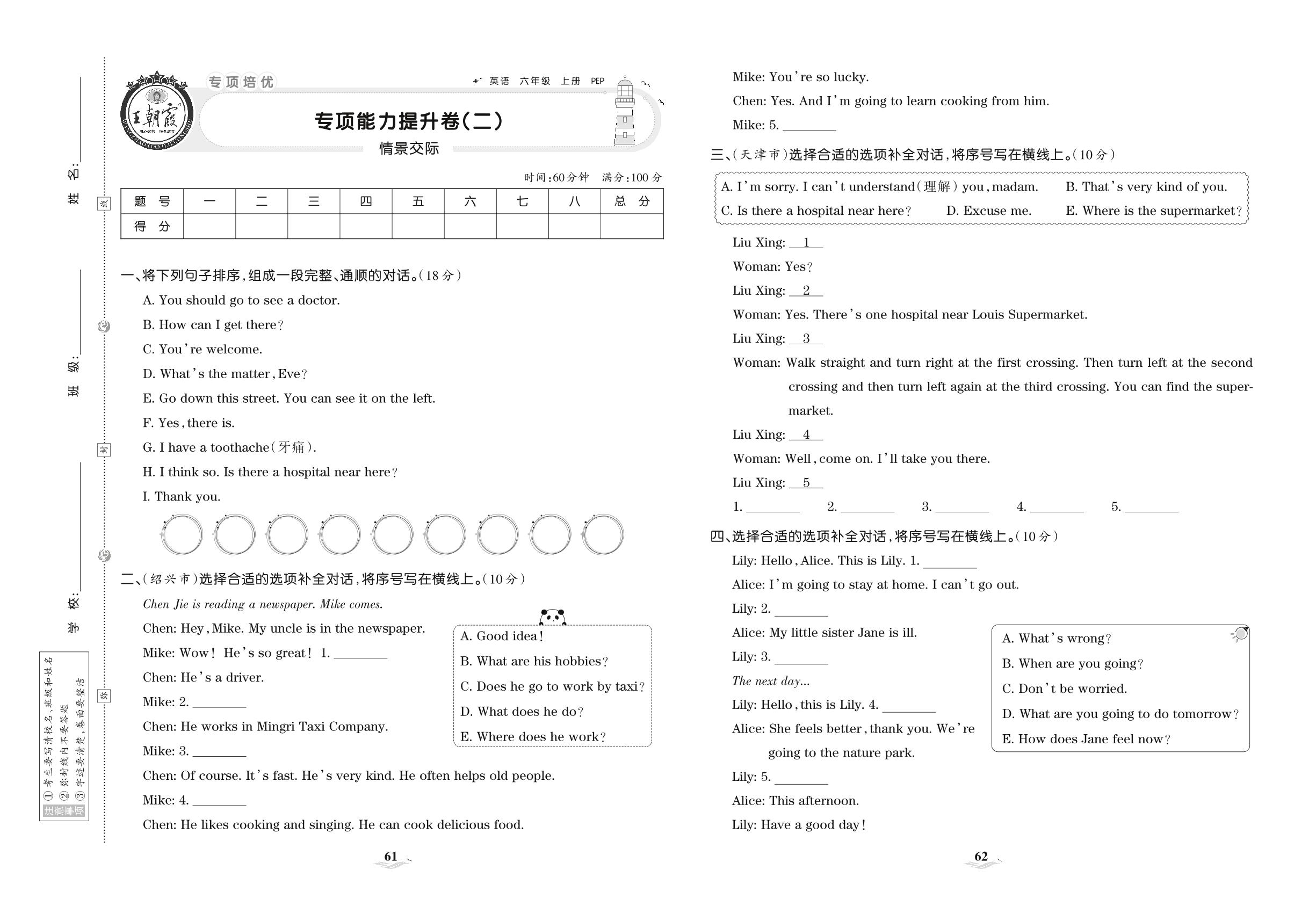 2021上册六年级英语人教PEP版 专项能力提升卷(二) 情景交际