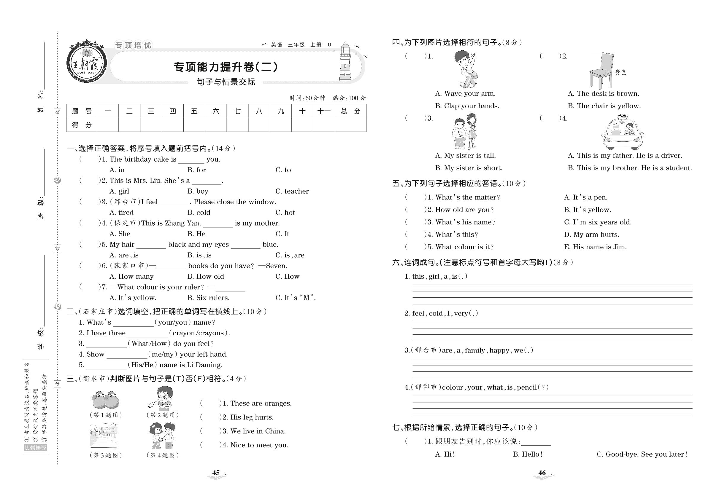 2021上册三年级英语冀教版 专项能力提升卷(二) 句子与情景交际