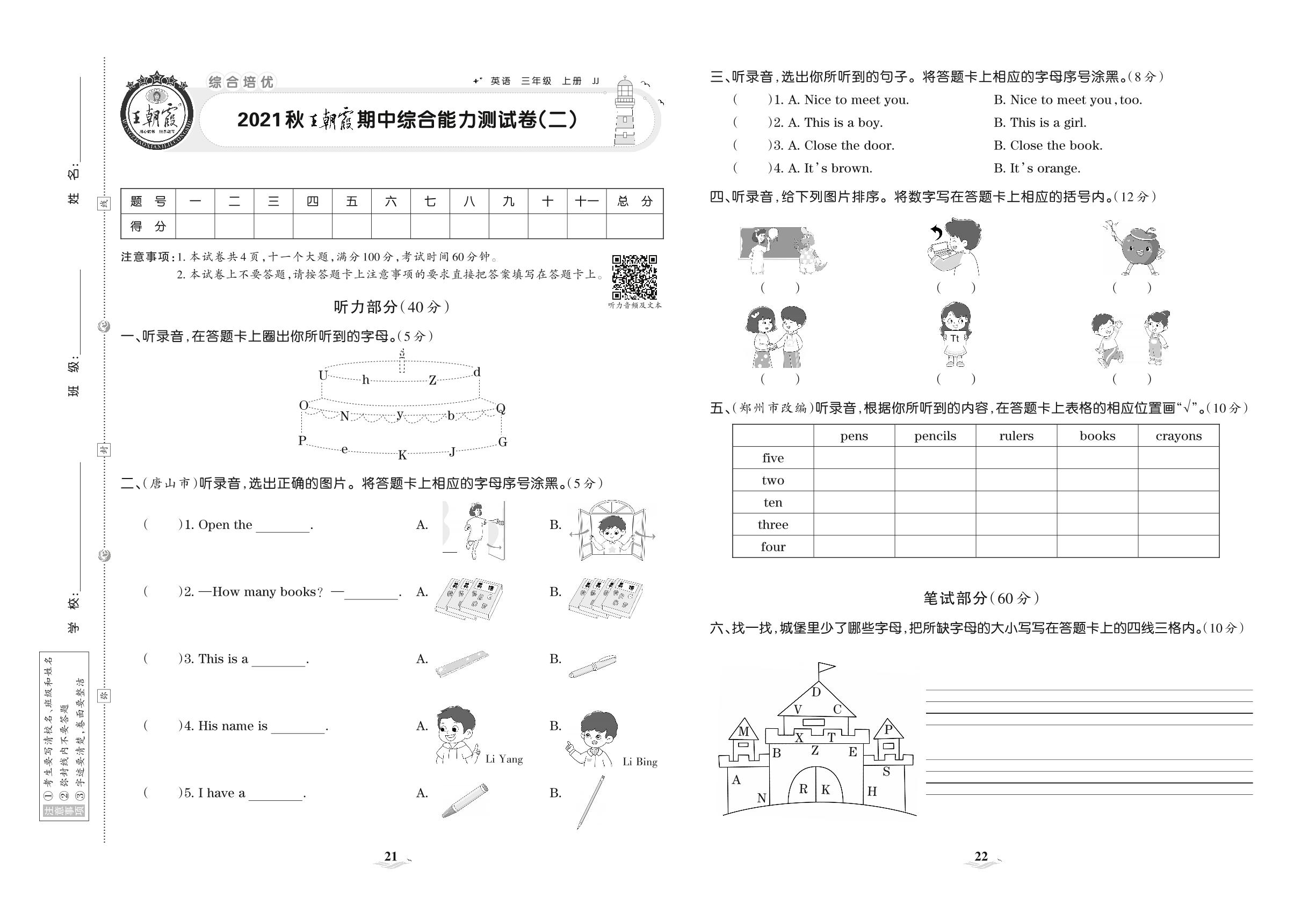2021上册三年级英语冀教版 王朝霞期中综合能力测试卷(二)
